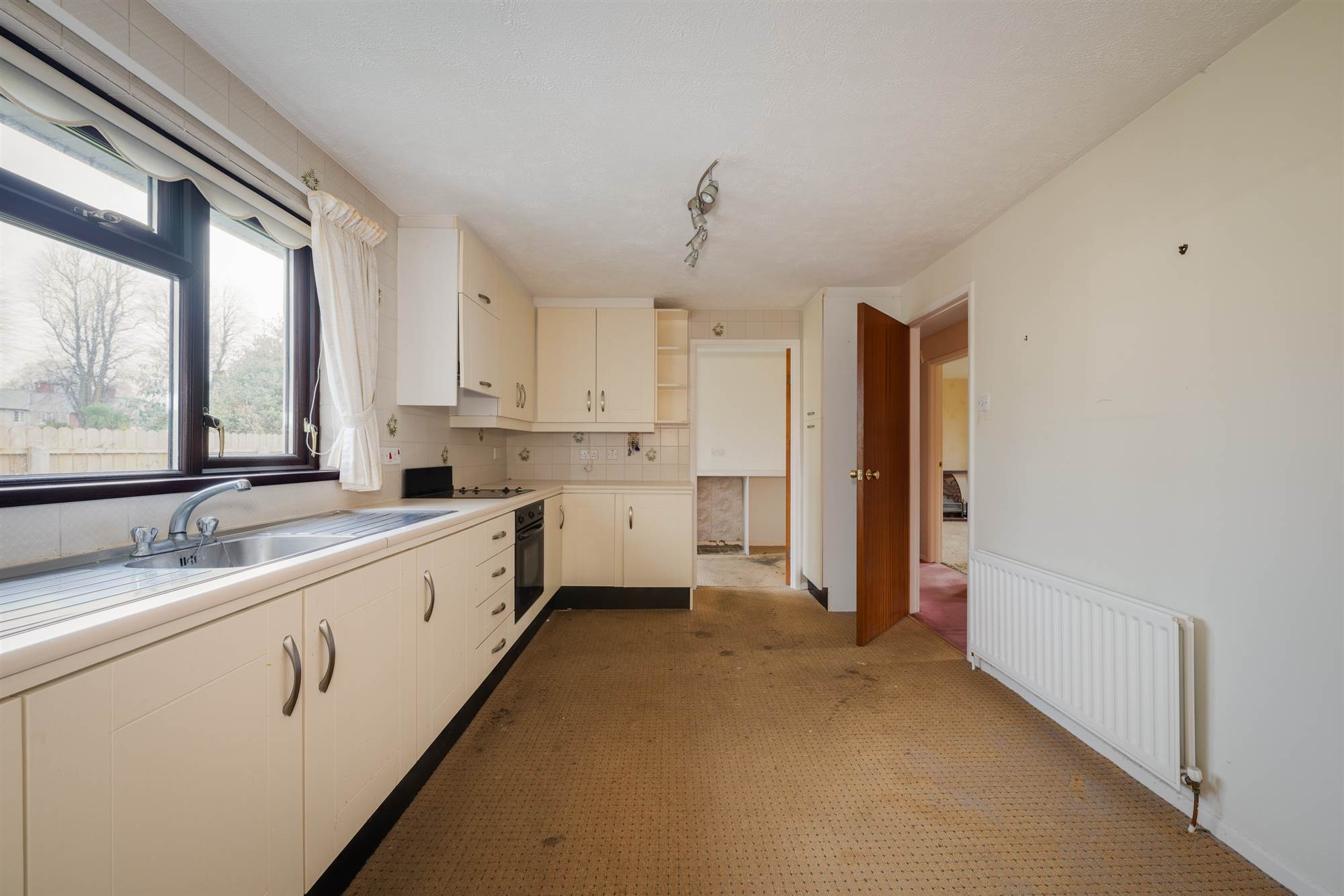 Range of high and low level units. Double drainer stainless steel sink unit. Integrated hob and oven. Breakfast area. Door to . . .