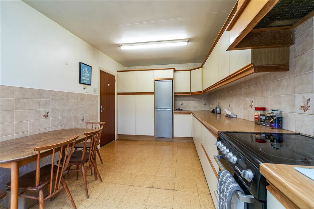 Range of high and low level units with complemantary worksurfaces, inset single drained sink unit, part tiled walls and double panel radiator.