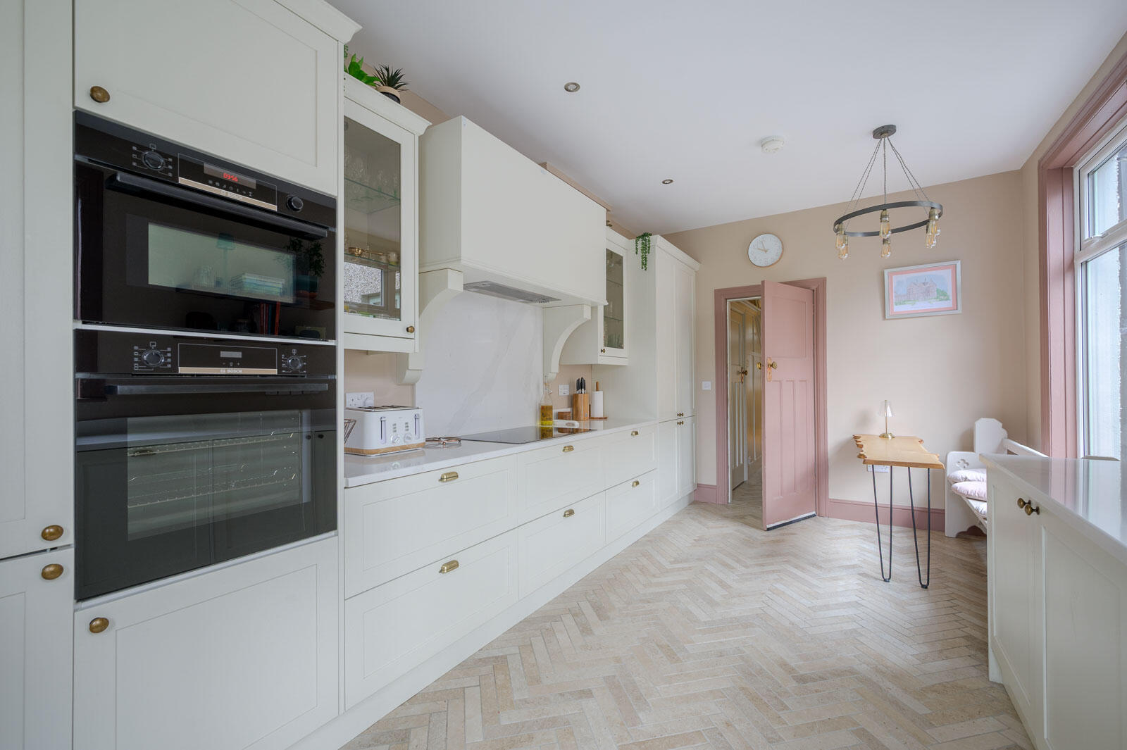 Bespoke range of shaker style high and low level units, quartz worktop, under mounted Franke basin and a half sink unit, black Quooker mixer tap with boiling water tap, integrated double oven, integrated induction hob and extractor fan, integrated dishwasher, integrated fridge freezer, glass display cabinets, recessed spotlights, PVC double glazed back door to rear garden, herringbone style tiled flooring.