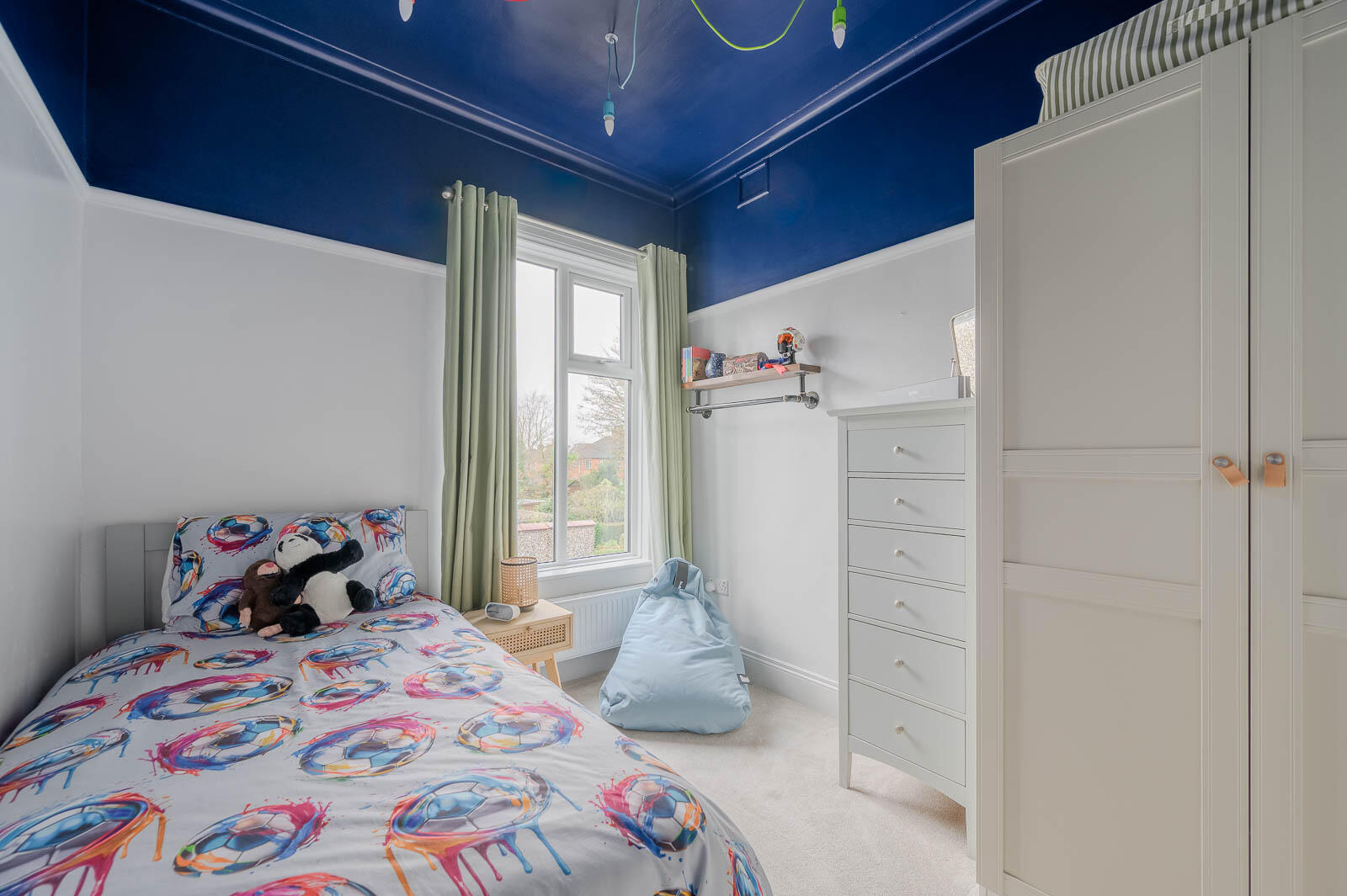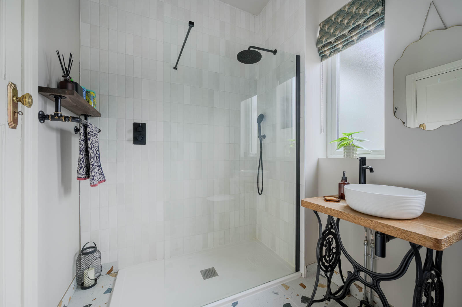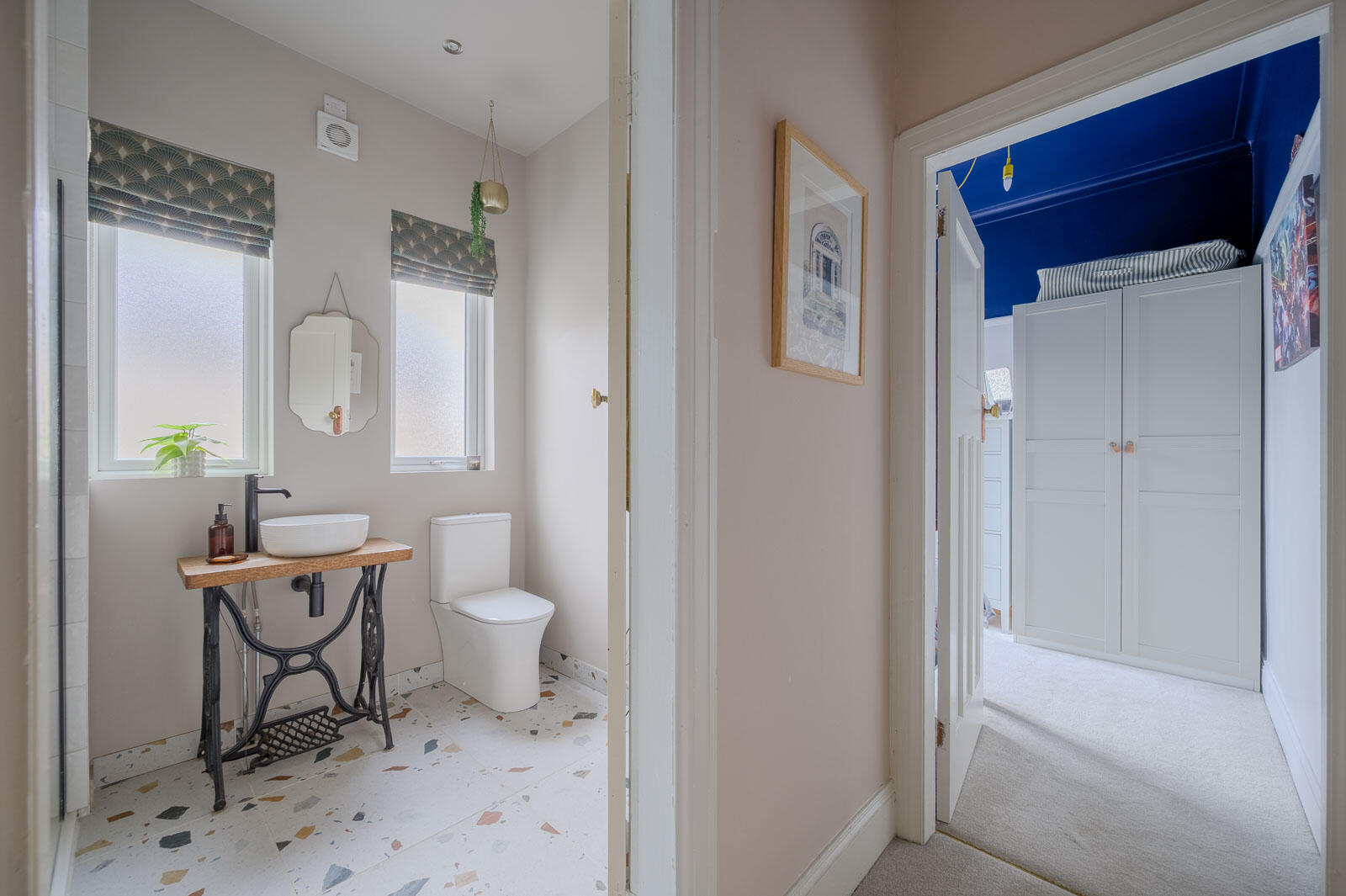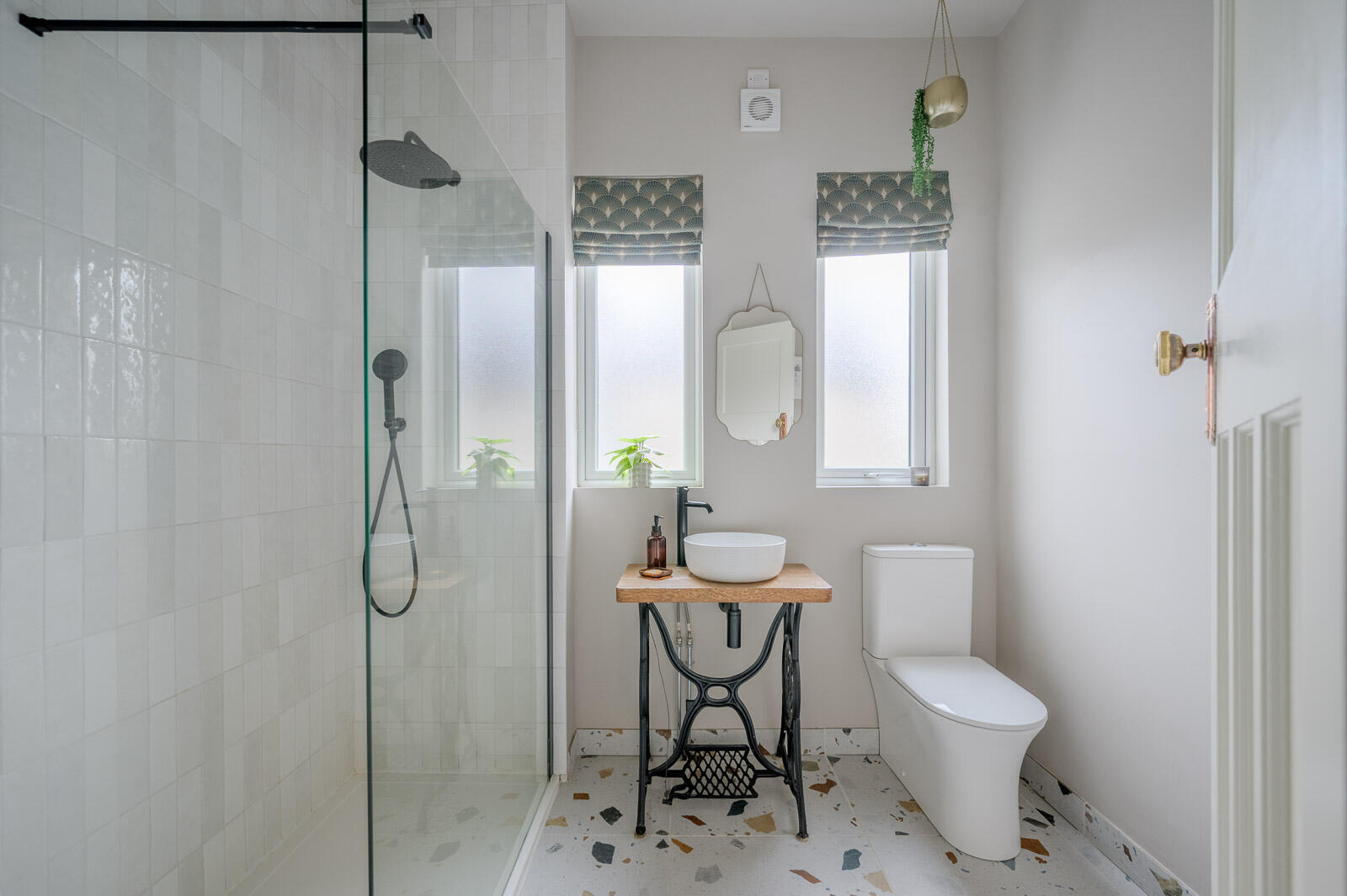 Upstairs, four well-proportioned bedrooms are finished in calm, stylish décor, with the principal bedroom enjoying a wide bay window and excellent natural light. The contemporary family shower room has been beautifully updated with a large walk-in shower, modern fixtures, and terrazzo-style flooring.