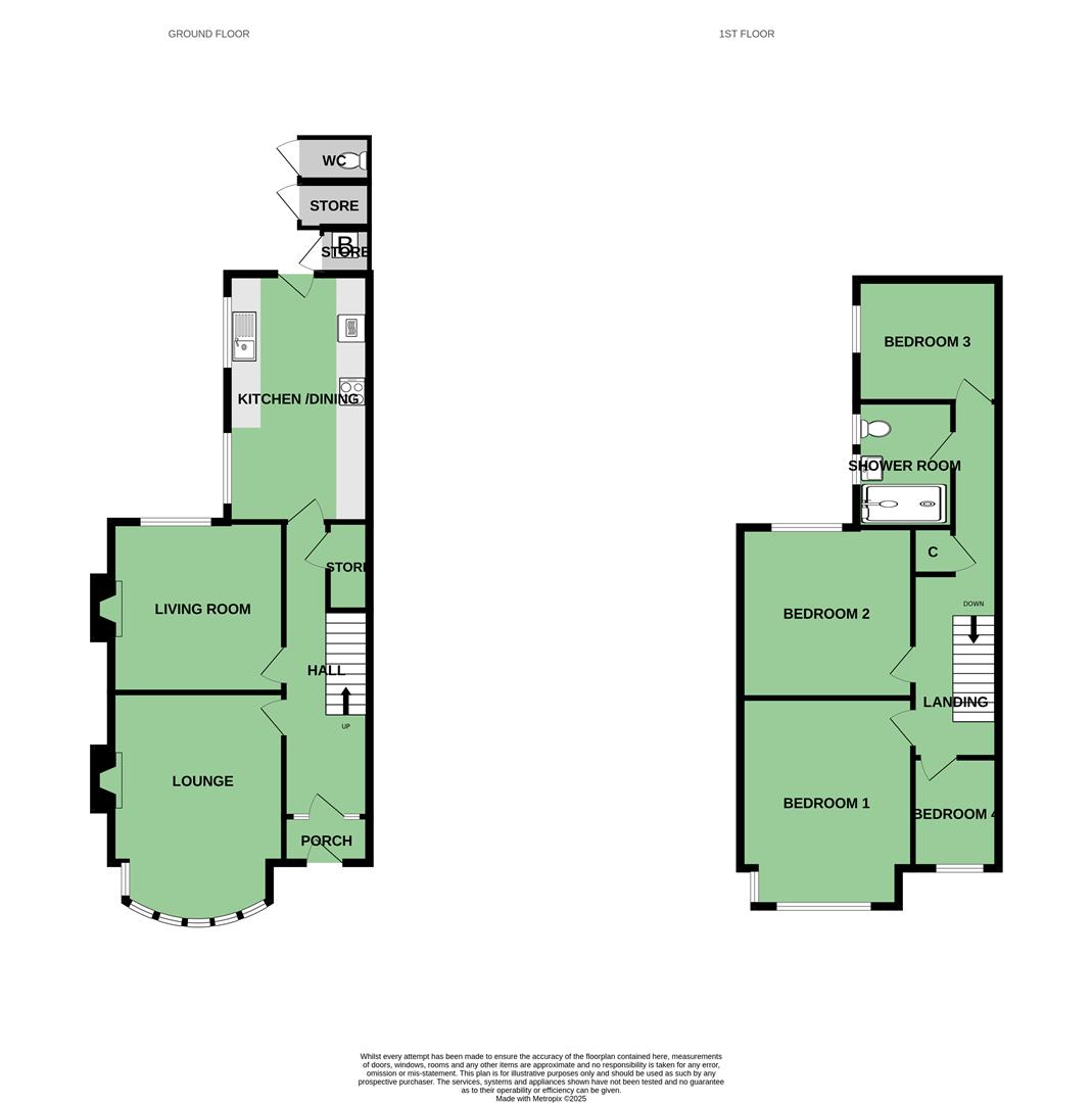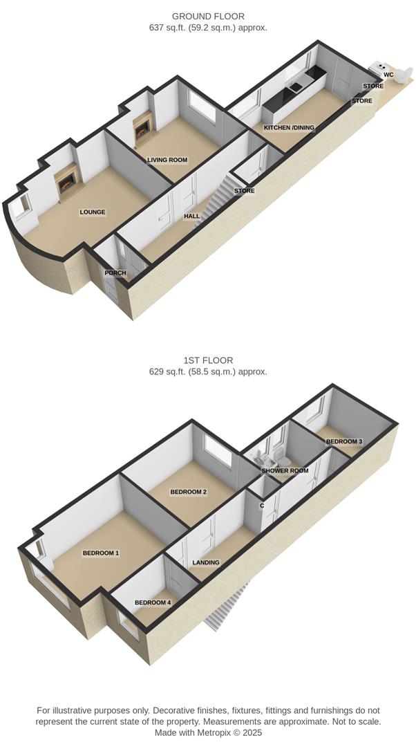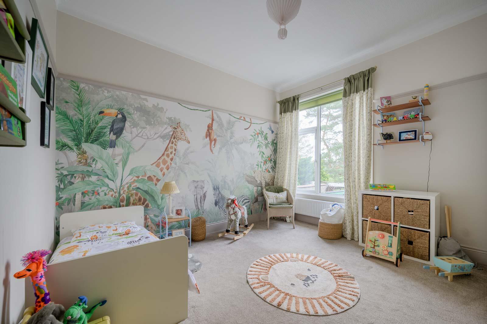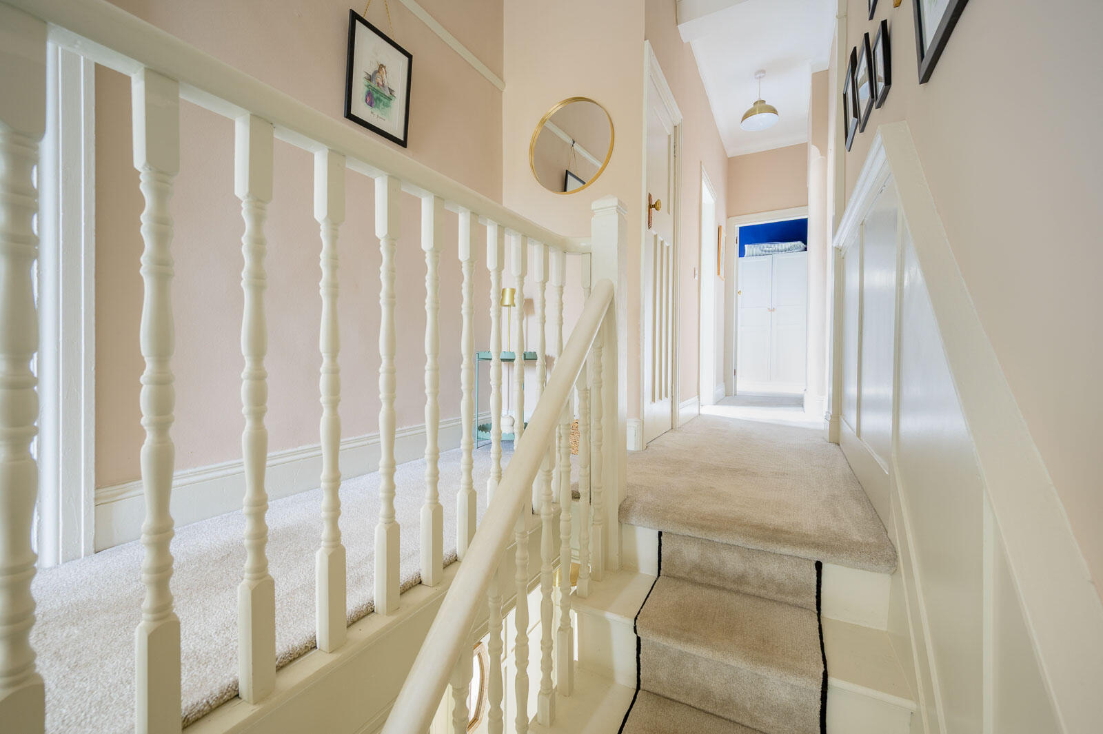 Upstairs, four well-proportioned bedrooms are finished in calm, stylish décor, with the principal bedroom enjoying a wide bay window and excellent natural light. The contemporary family shower room has been beautifully updated with a large walk-in shower, modern fixtures, and terrazzo-style flooring.