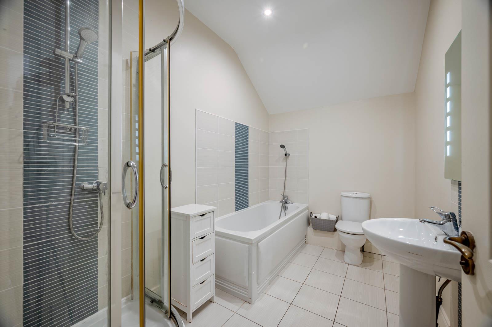 Measurements at widest points. White suite comprising: low flush WC with push button, panelled bath with chrome mixer tap and tiled splashback, tiled walls, corner shower unit with glass sliding door, shower with chrome thermostatic control valve and up and over telephone hand unit, extractor fan, wash hand basin on pedestal with chrome mixer tap and tiled splashback, fitted mirror and chrome heated towel rail.