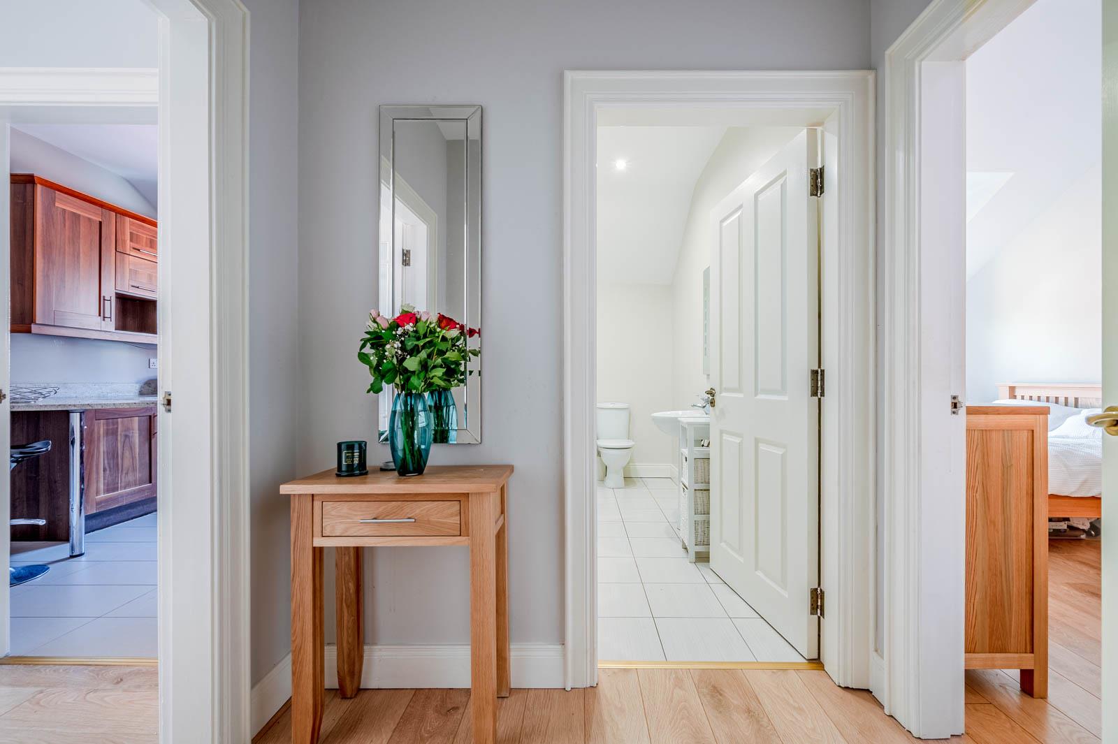 Wooden laminate effect flooring, generous built-in storage cupboard with access to electric meter, further enclosed hallway with access hatch to roof space.