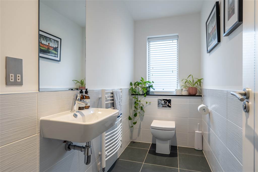 Saneux sanitary ware with concealed cistern w.c. with soft close seat, wash hand basin, feature wall and floor tiling.