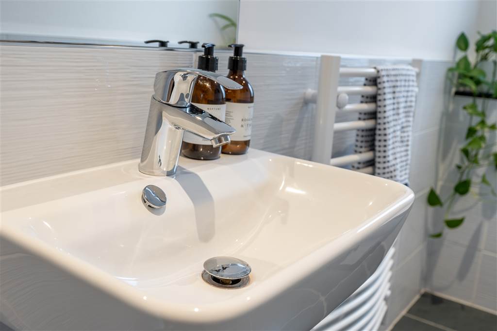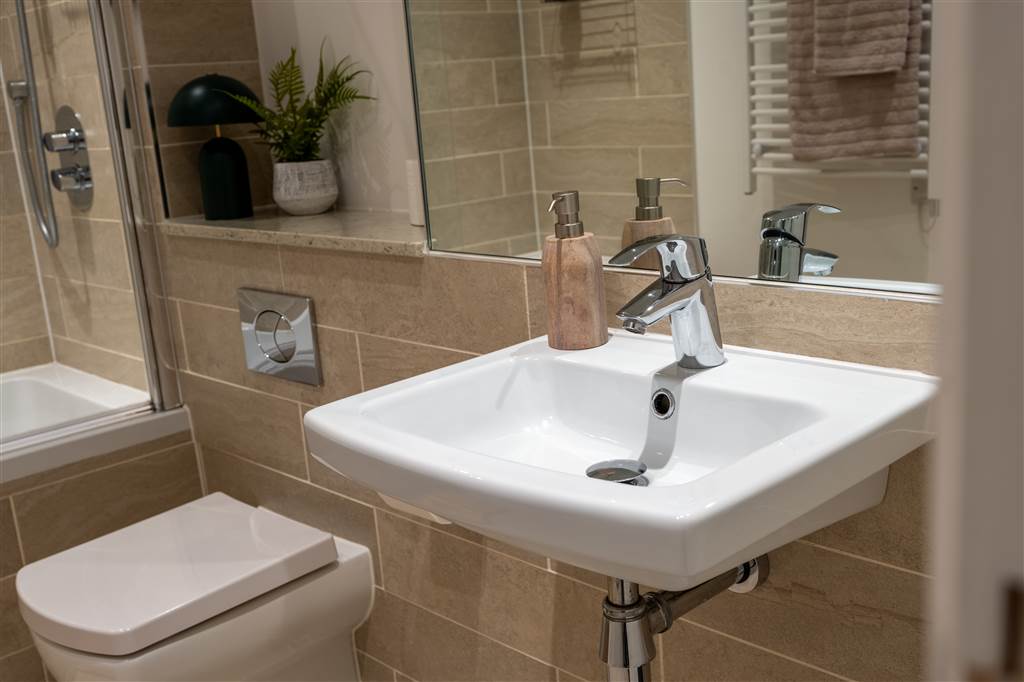 Luxury suite comprising panelled bath with Vado rain shower with separate controls over, concealed cistern w.c. with soft close seat, wash hand basin, shaving socket, electric heated towel rail, feature wall and floor tiling.