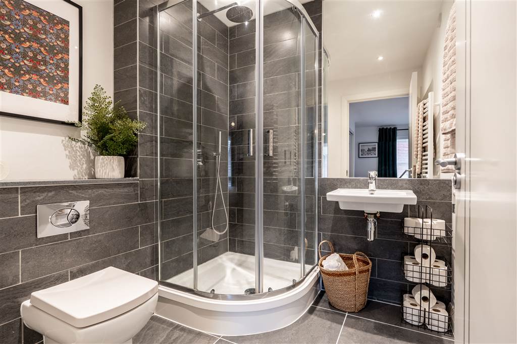 Saneux sanitary ware with large shower tray, Vado rain shower with hand attachment, glazed screen, concealed cistern w.c. with soft close seat, wash hand basin, shaving socket, electric heated towel rail, feature wall and floor tiling.