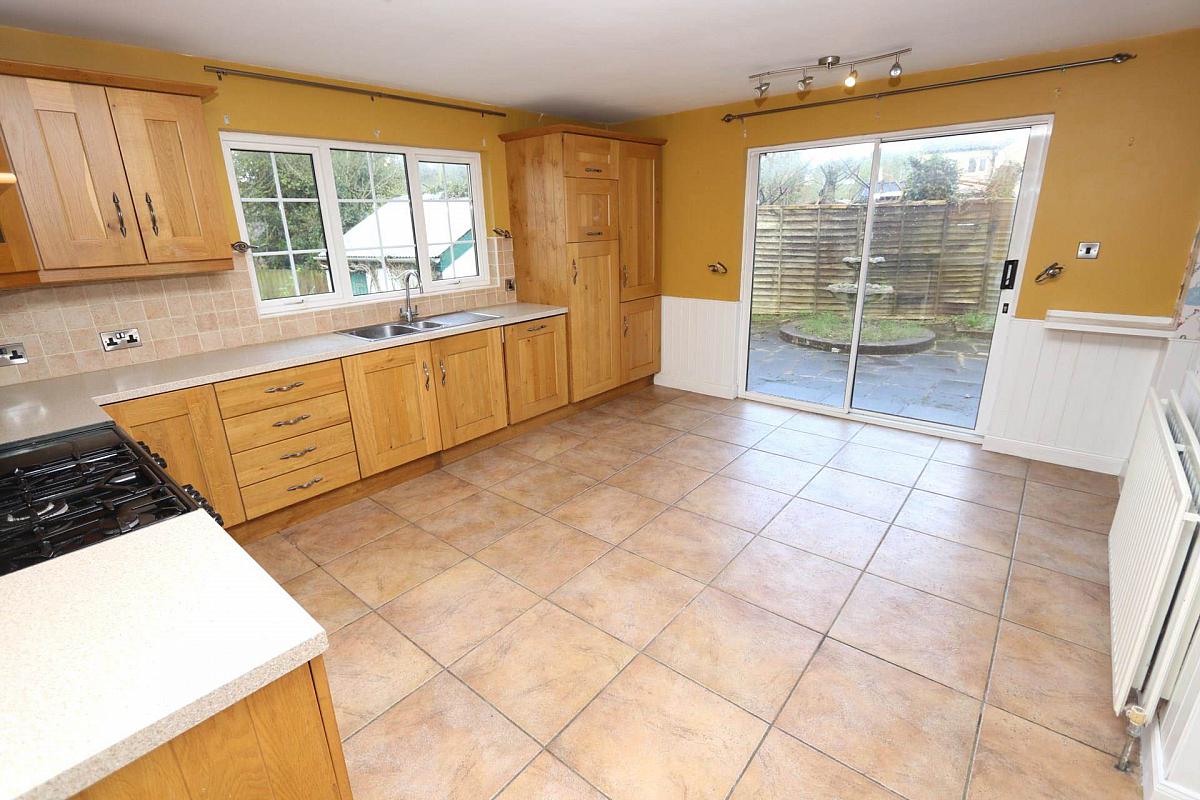 Solid oak kitchen, ample storage & sliding patio doors