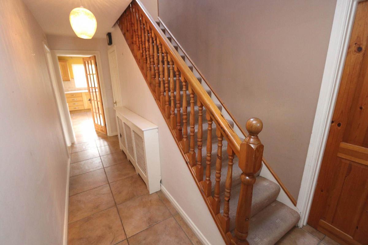 Upstairs, three generously sized bedrooms, two of which benefit from built in wardrobes, along with the main family bathroom, offer a bright and clean finish, featuring a bath and separate shower. Additionally, a large hotpress provides ideal storage solutions.