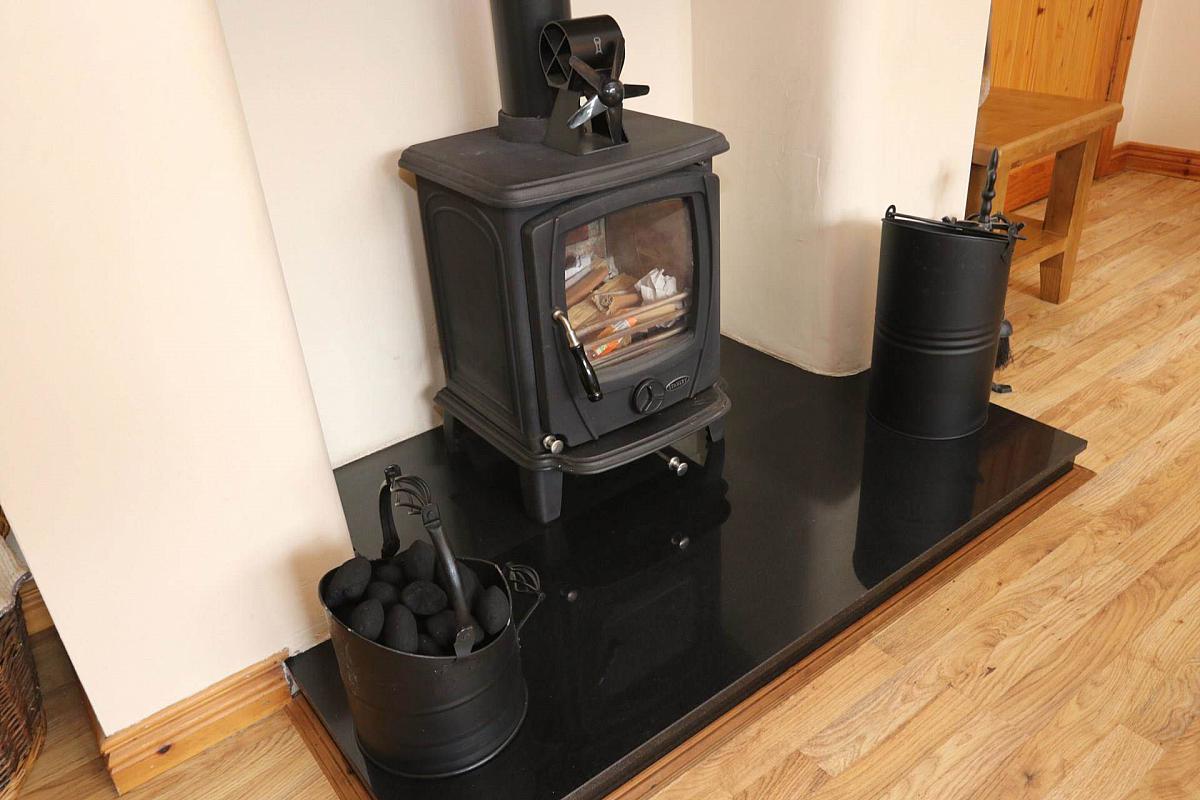 Living Room: Family living room featuring a cozy stove and access to the dining room.