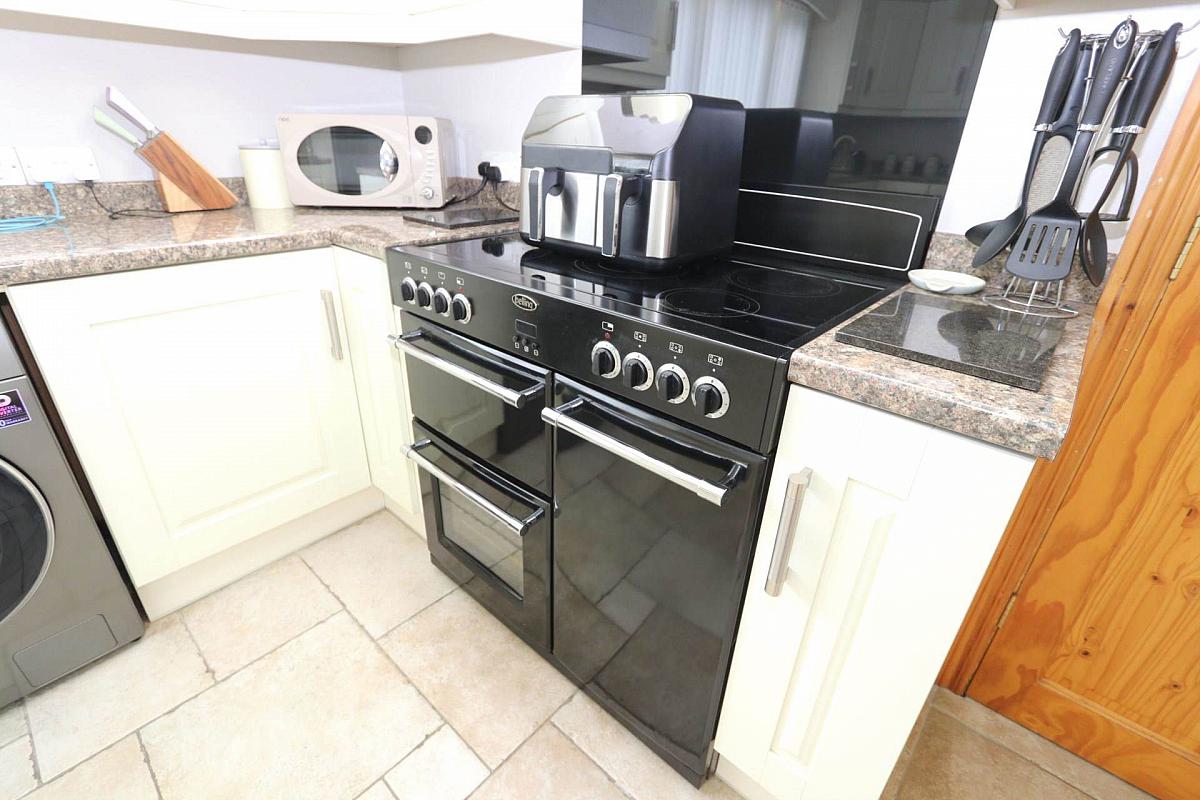 Kitchen: Modern kitchen with a central island, range cooker, integrated dishwasher, and generous cupboard space, with access to the dining room. Perfect for hosting, with French doors leading to the outdoor patio area.