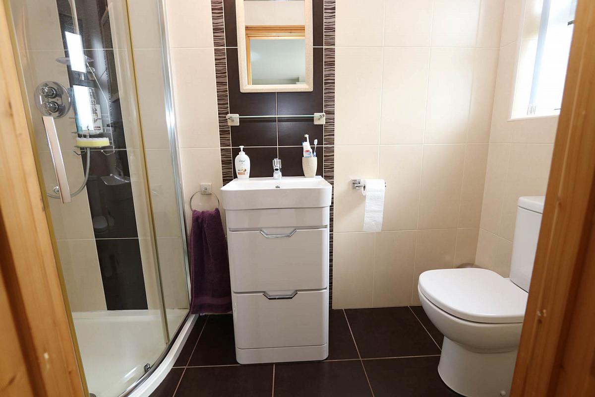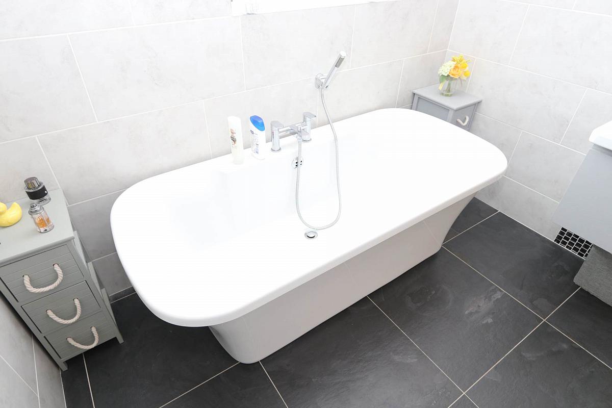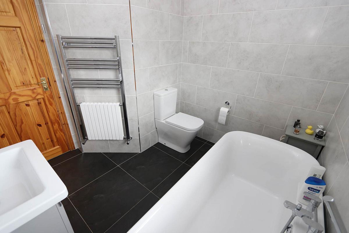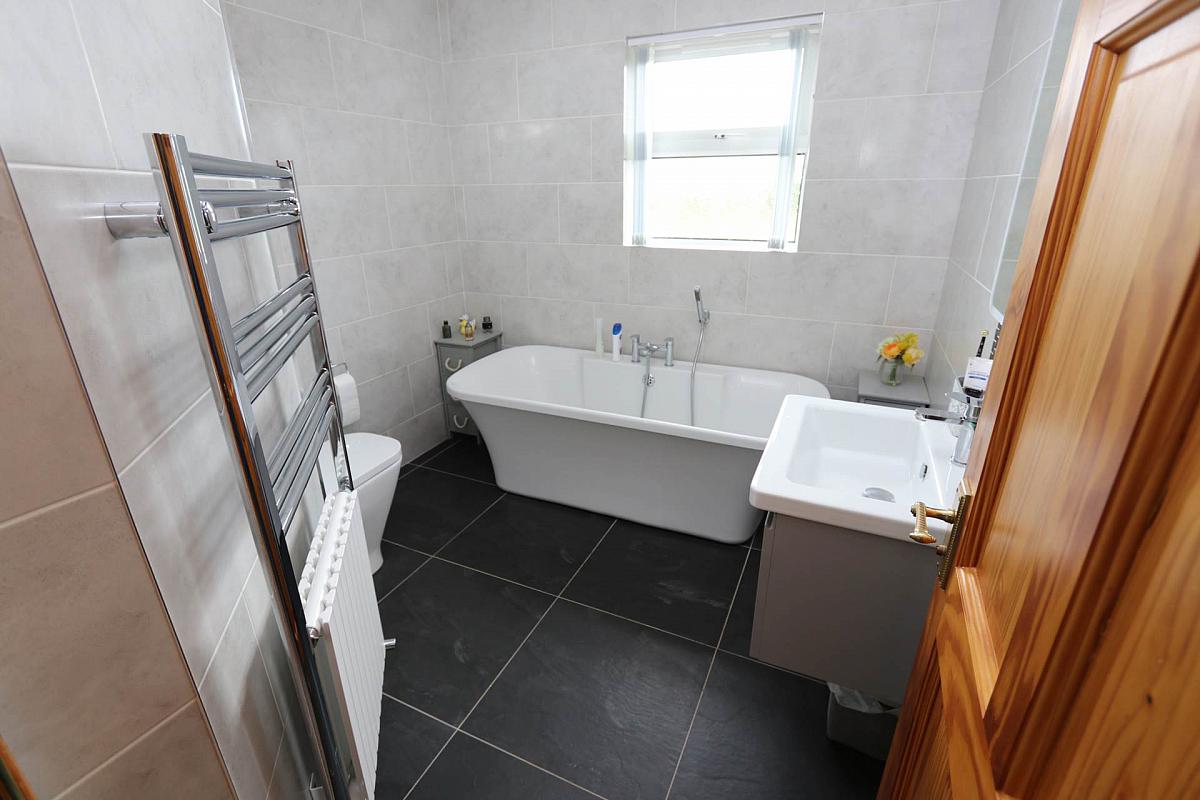 Family Bathroom: Modernly decorated with fully tiled walls and floor, featuring a freestanding bath and vanity sink.