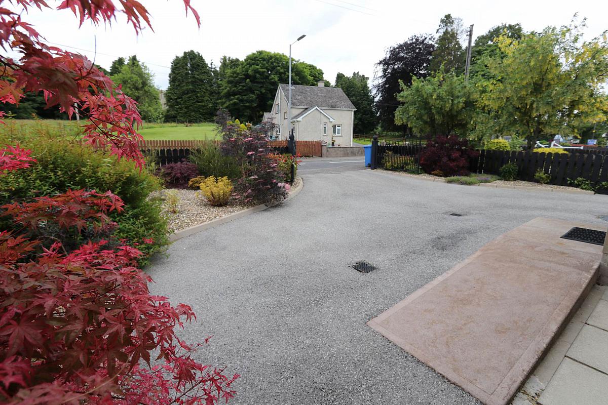 Front: Gated entrance with low-maintenance flower beds with planted shrubs and trees, and off-street parking on the tarmac drive.