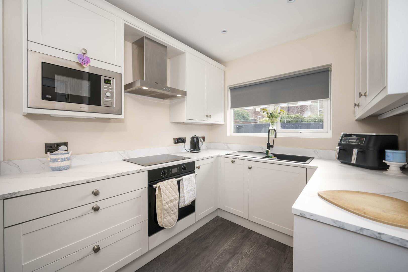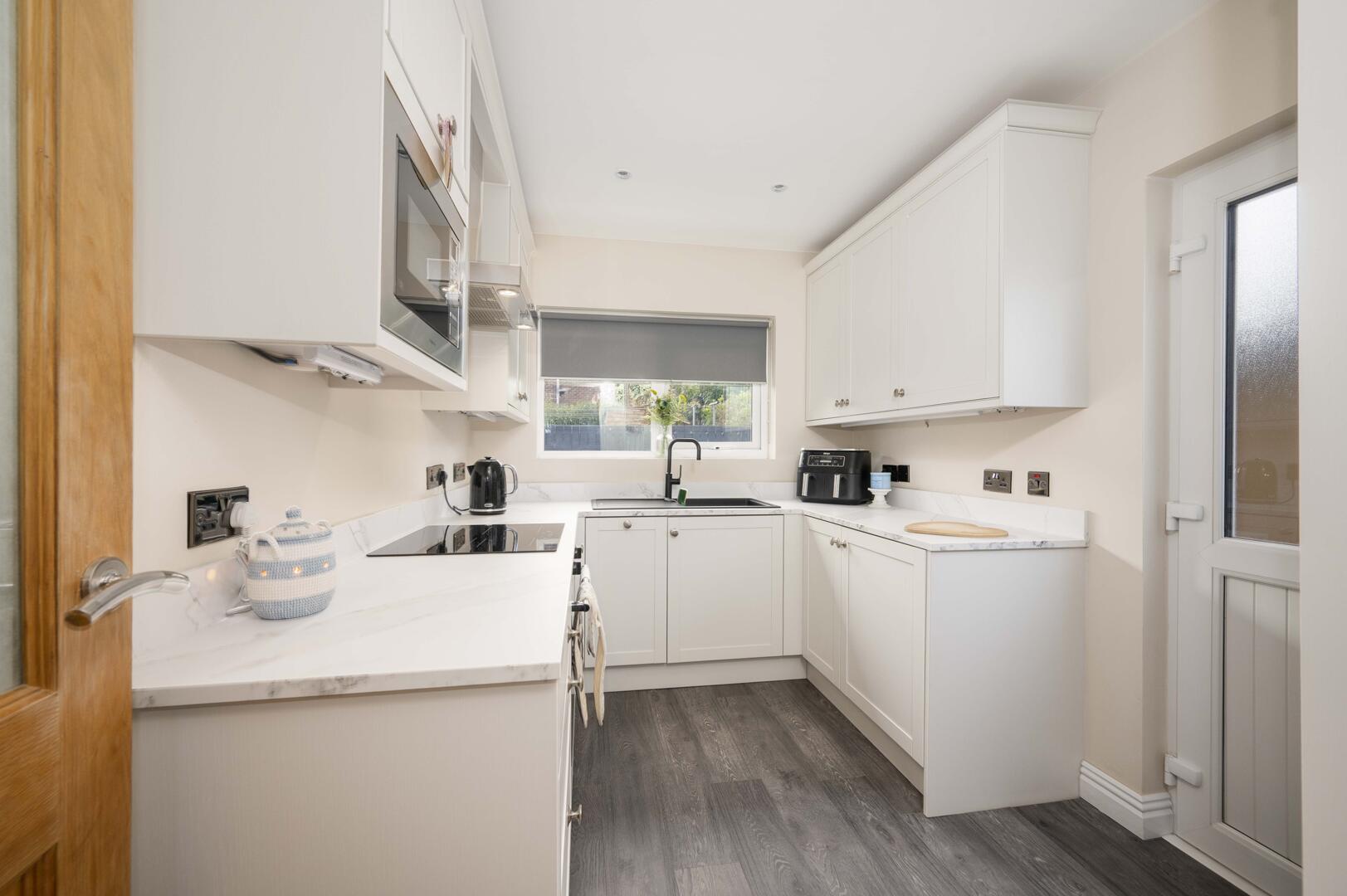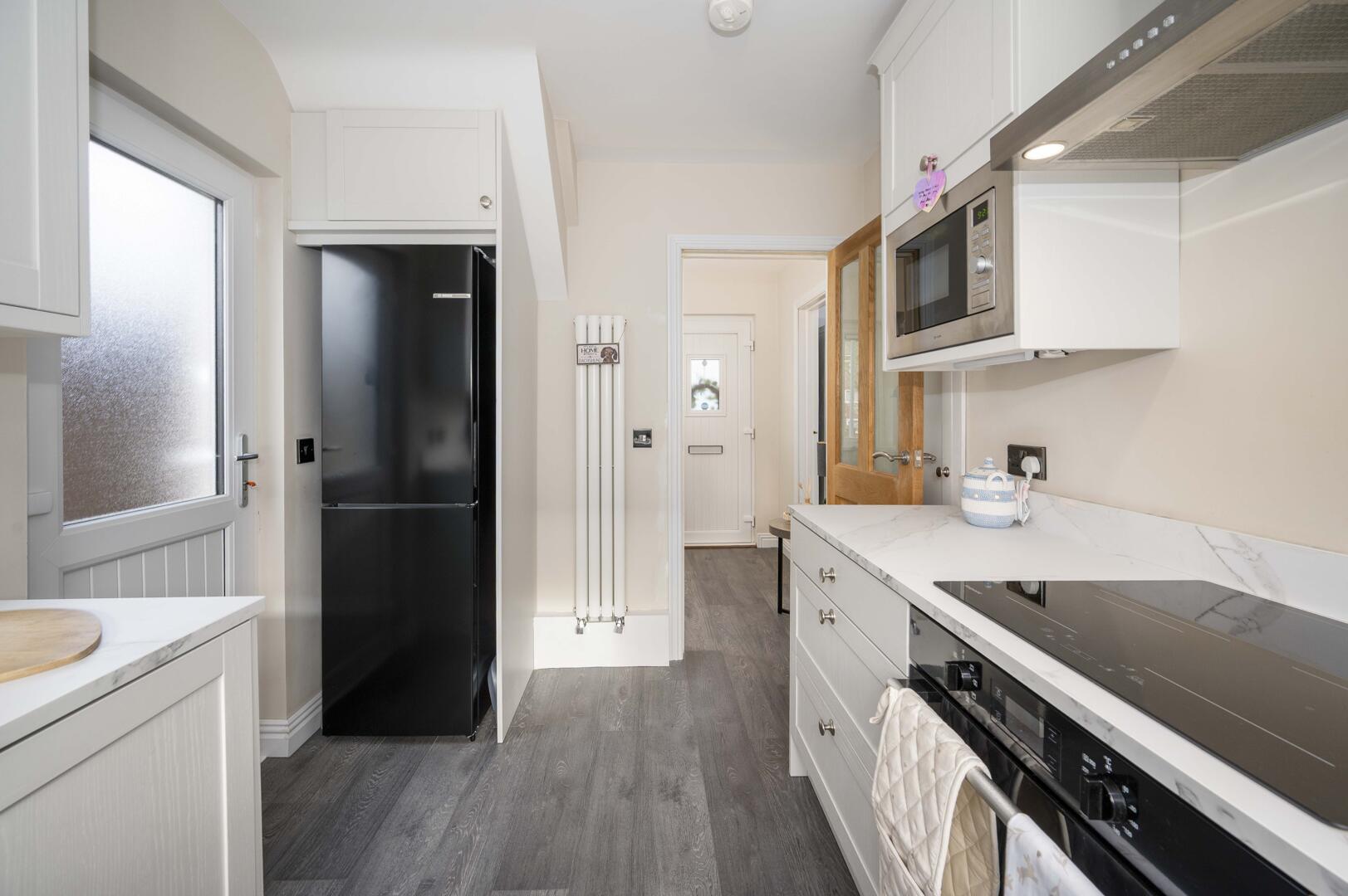 Excellent range of high and low level units, stainless steel fittings, laminate worktop, matt black sink and matt black mixer tap, built-in low level oven, four ring induction hob with stainless steel extractor hood above, integrated microwave, integrated washing machine, space for fridge freezer, laminate wooden floor, recessed spotlighting, outlook to rear garden, uPVC double glazed access door to rear garden, built-in storage cupboard.