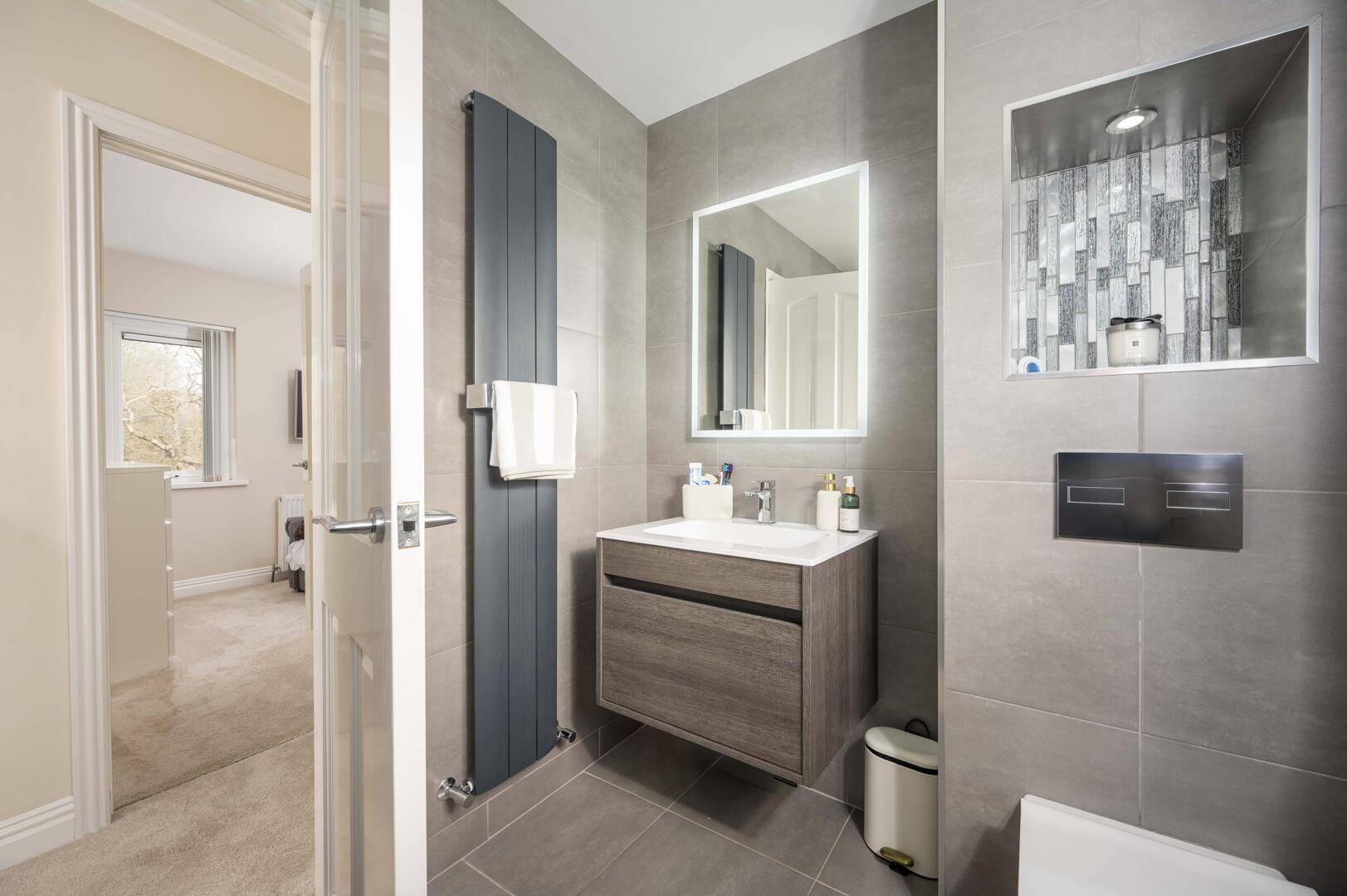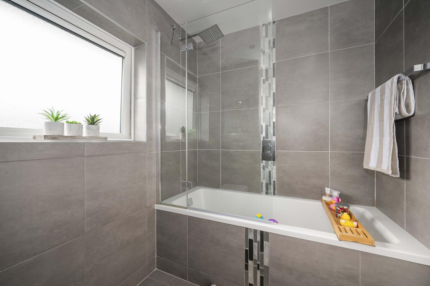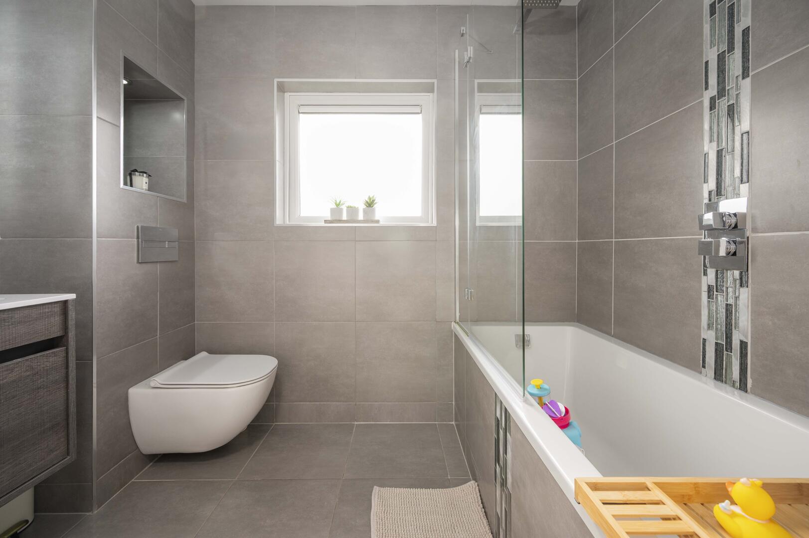 Modern white suite comprising low flush WC, vanity unit with chrome mixer taps, tiled panelled bath with thermostatically controlled valves and overhead shower, ceramic tiled floor, fully tiled walls, LED lighting, frosted glass window, tongue and groove ceiling and matt grey vertical radiator.