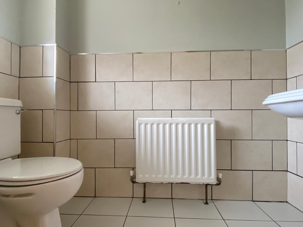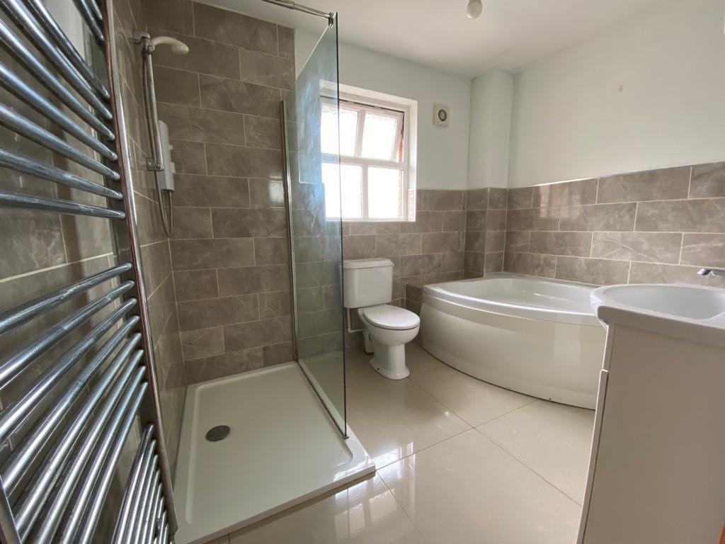 Comprising corner bath, walk in electric shower, whb set in vanity unit, wc, chrome radiator, 1/2 tiled walls, tiled floor.