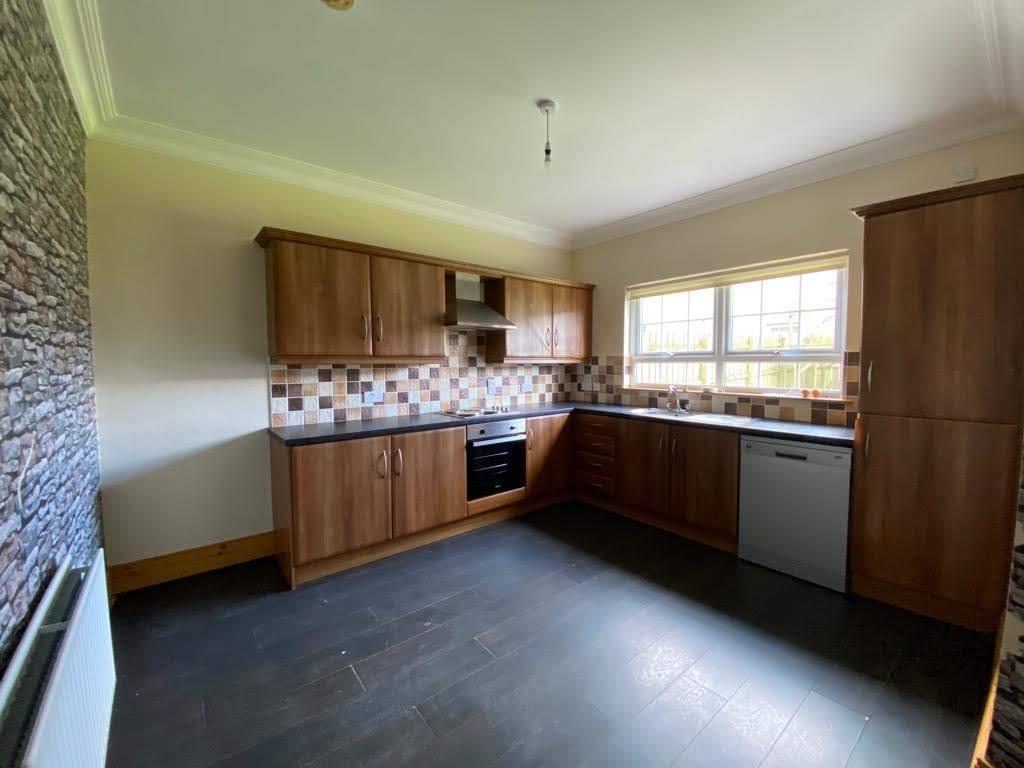 Having eye and low level units, tiling between units, single drainer stainless steel sink unit with mixer taps, hob, underoven, stainless steel extractor hood, integrated fridge / freezer, plumbed for dishwasher, dining space, ceiling cornicing and laminated wooden floor.