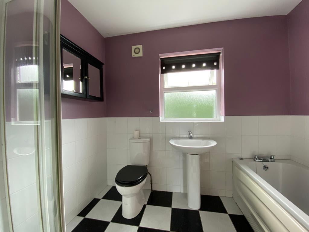 Comprising bath; wash hand basin and WC; tiled walk in shower; half tiled walls; tiled floor