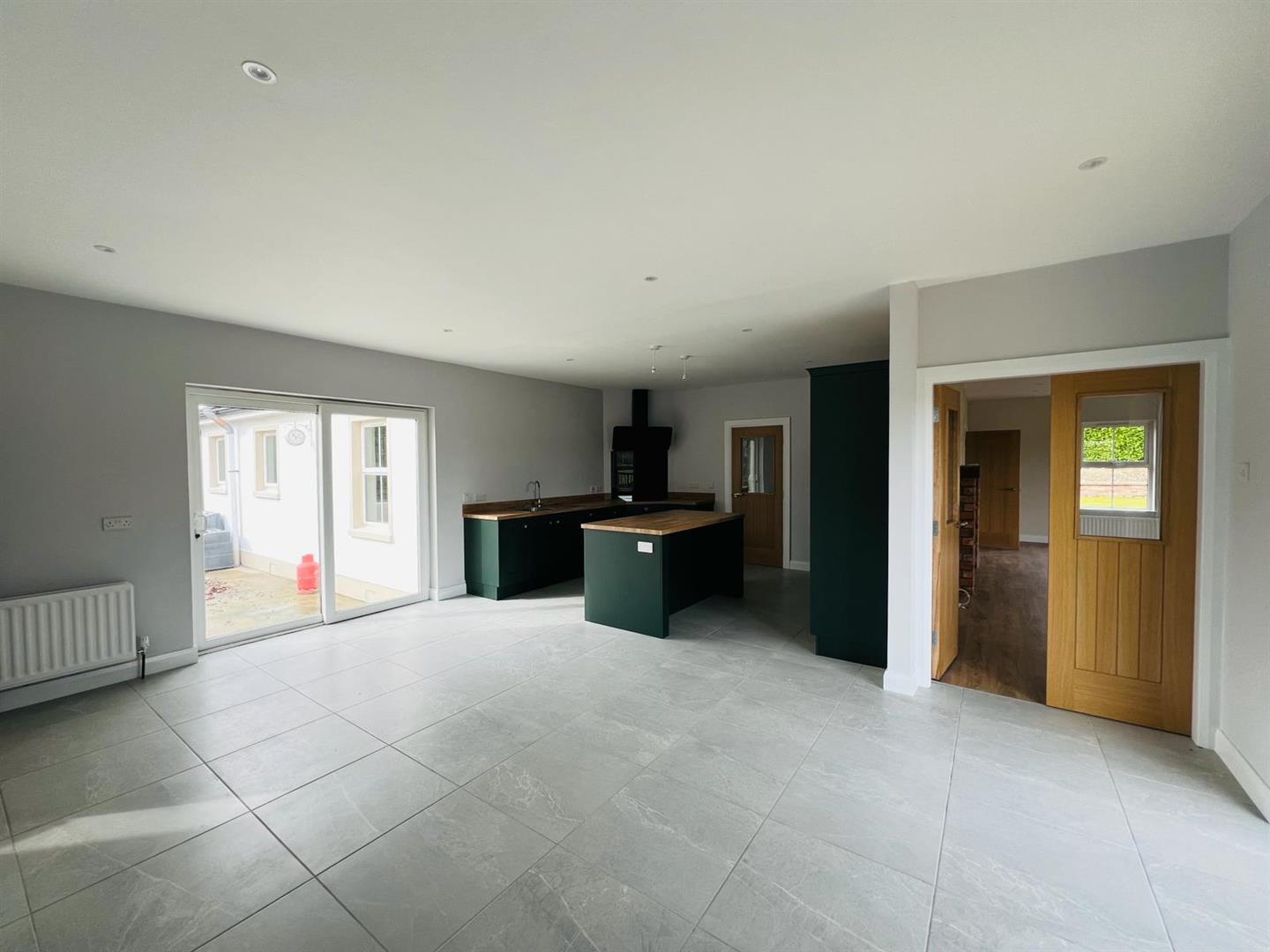 Having range of eye and low level units, single drainer stainless steel sink unit with mixer taps, centre island, hob, oven, extractor hood, space for American style fridge / freezer, integrated dishwasher, ample dining space, tiled floor, French doors leading to decked patio area, sliding patio doors to side.