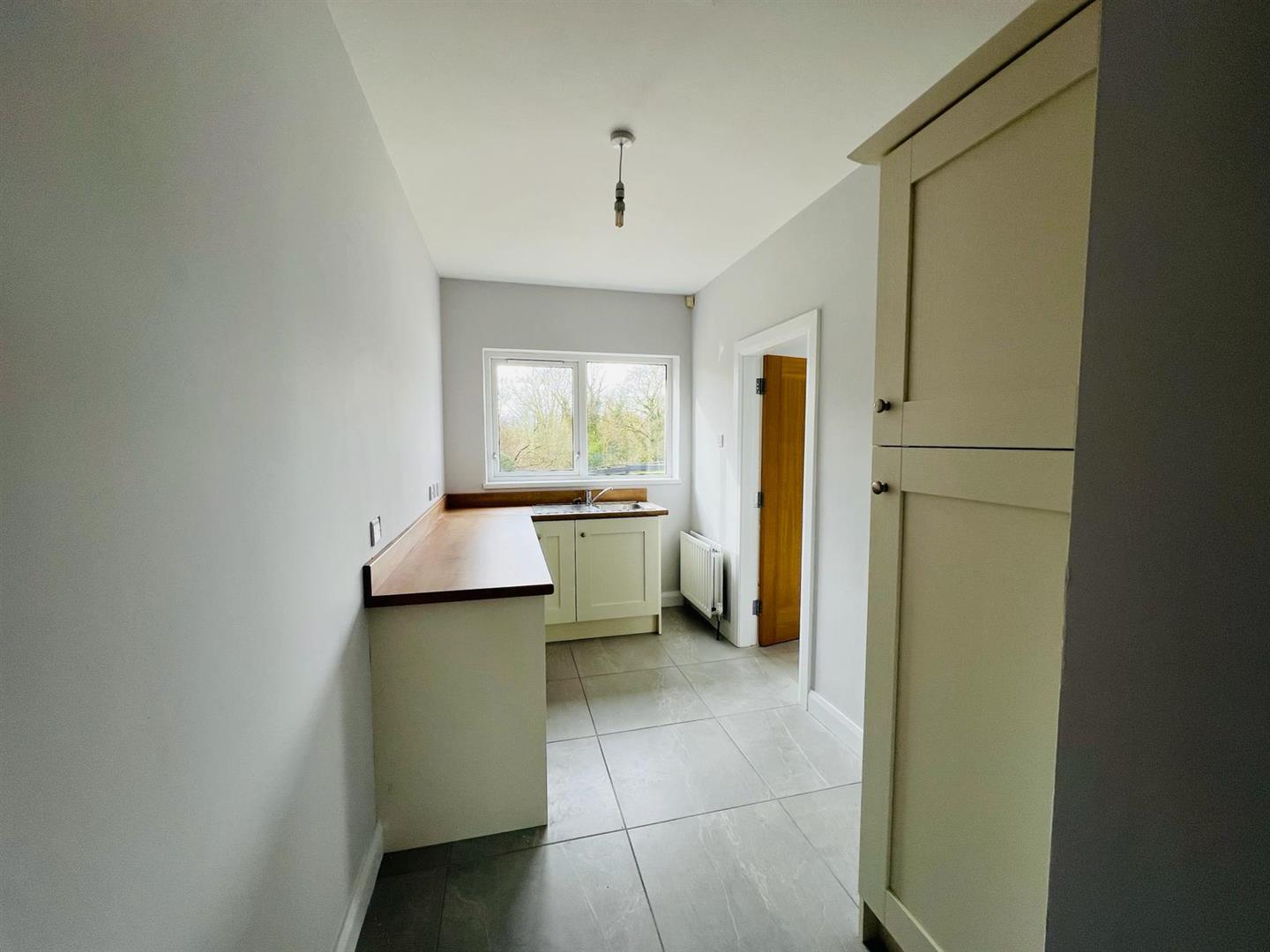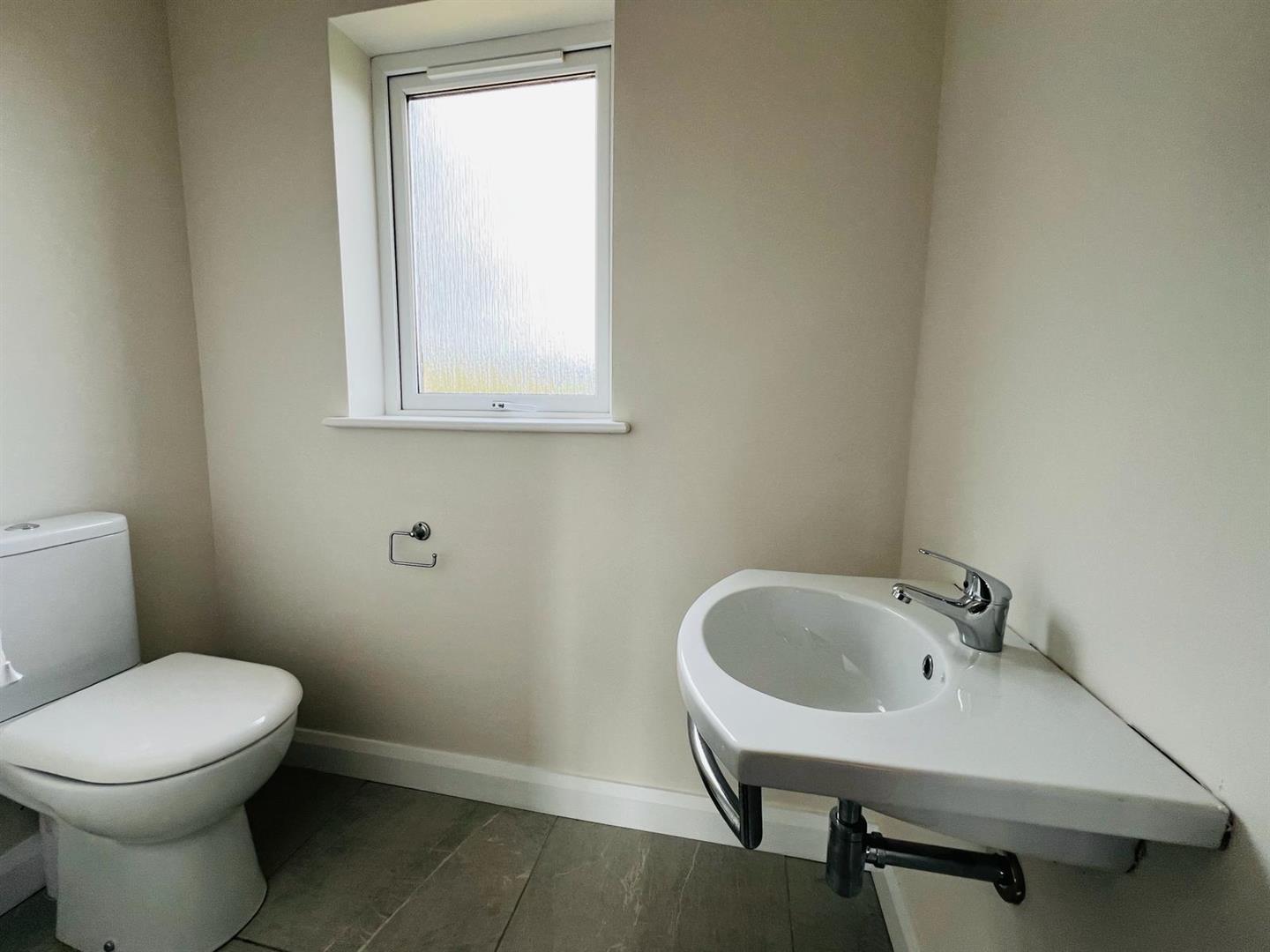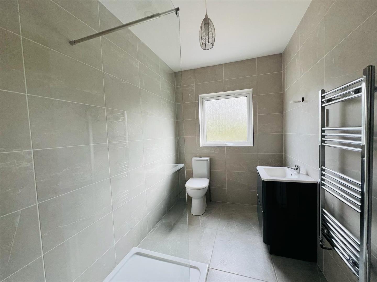 Comprising walk in shower, whb set in vanity unit, wc, chrome radiator, fully tiled walls and floor.