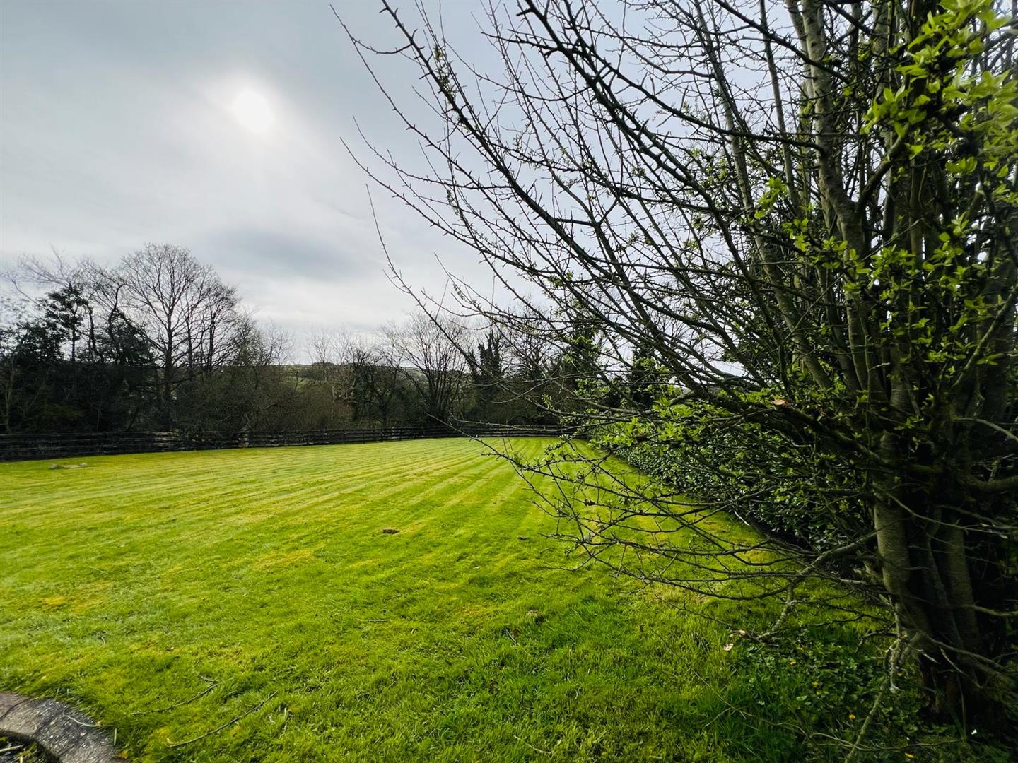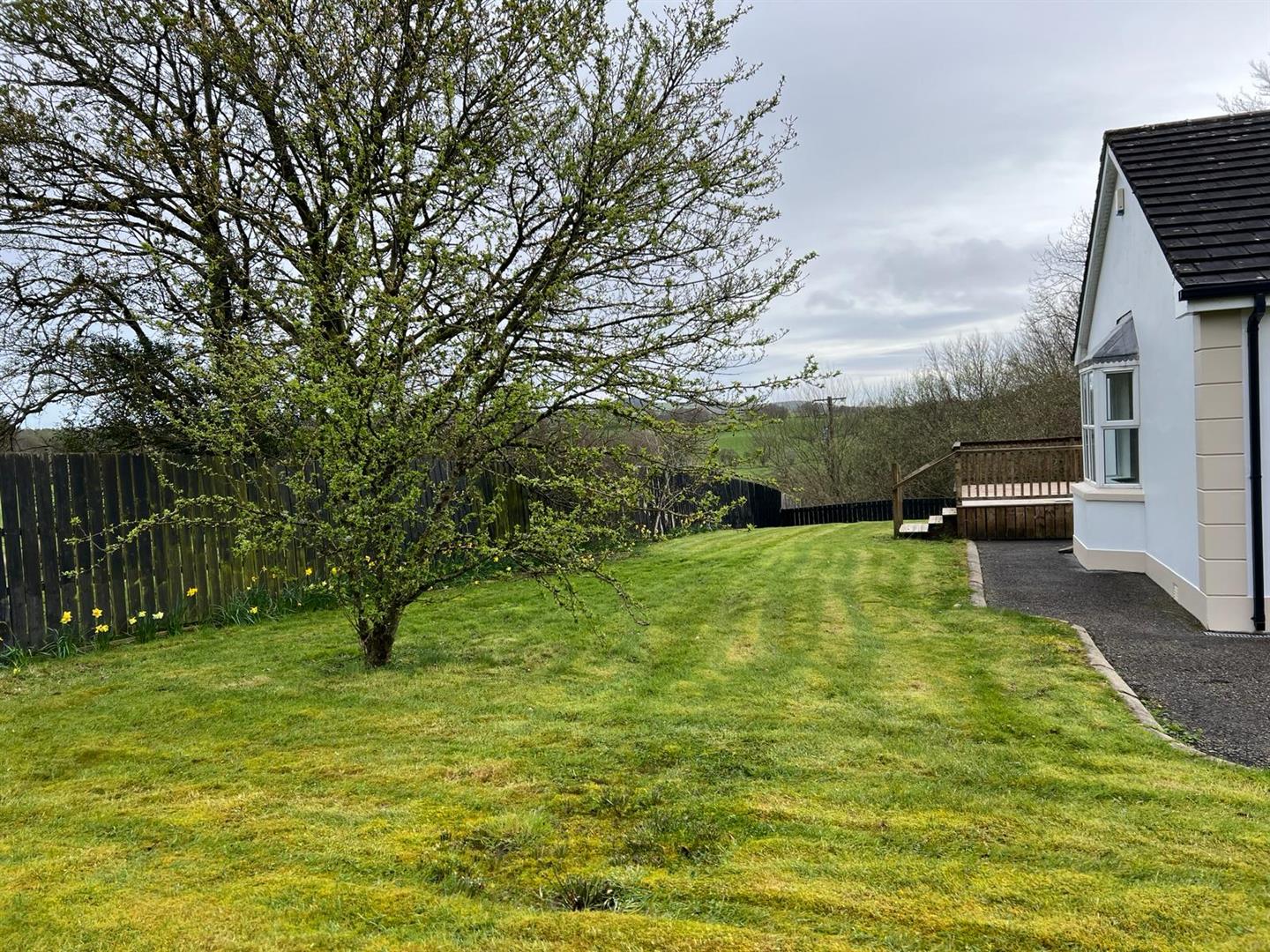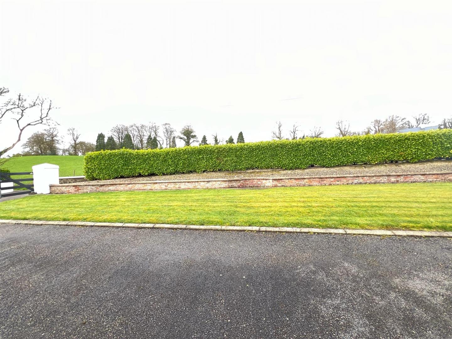 Neat lawn to front. Extensive side lawn bordered by hedging and fence.
