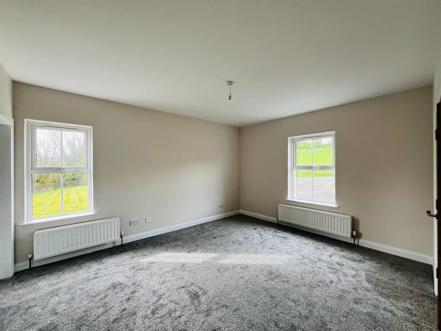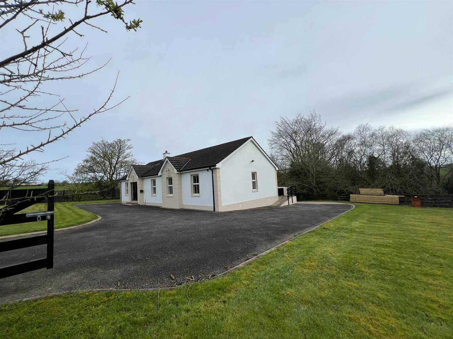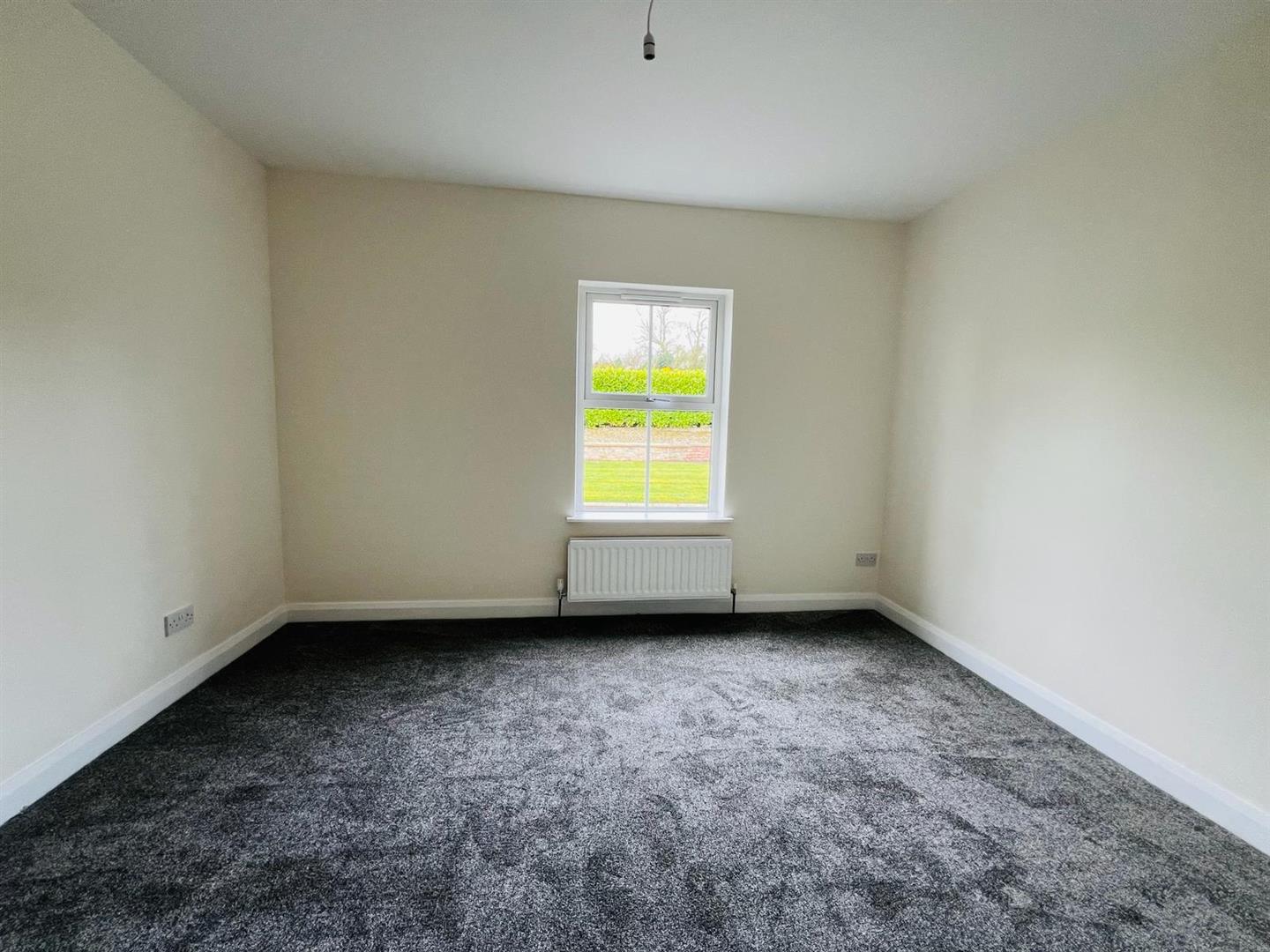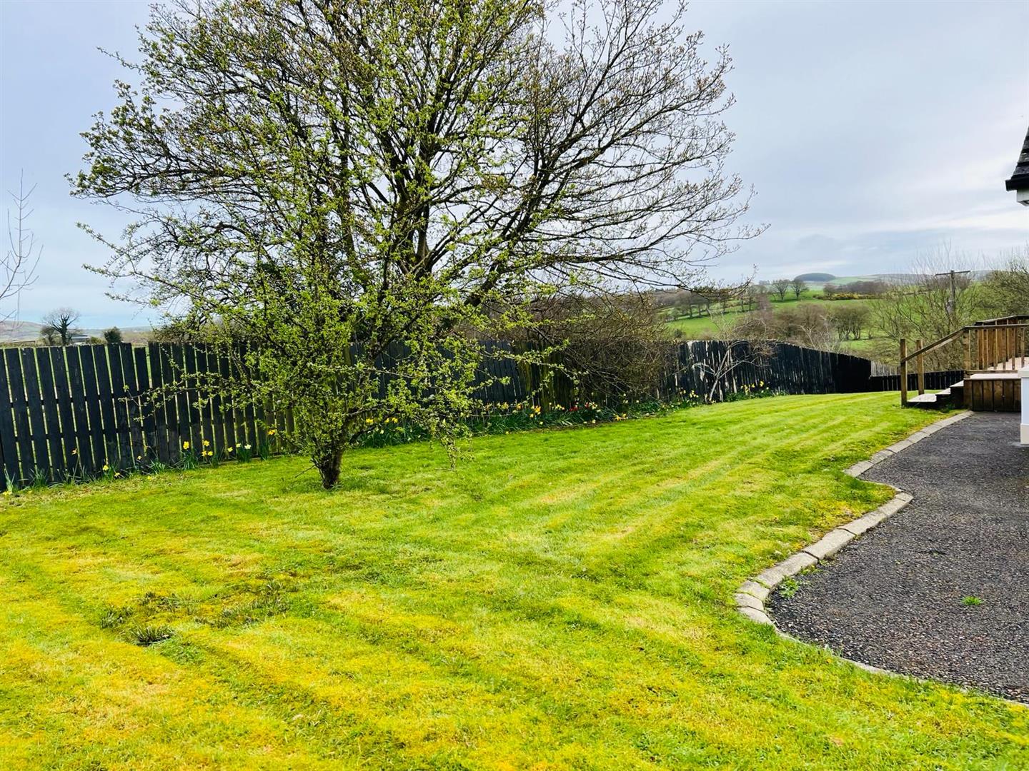 Neat lawn to front. Extensive side lawn bordered by hedging and fence.