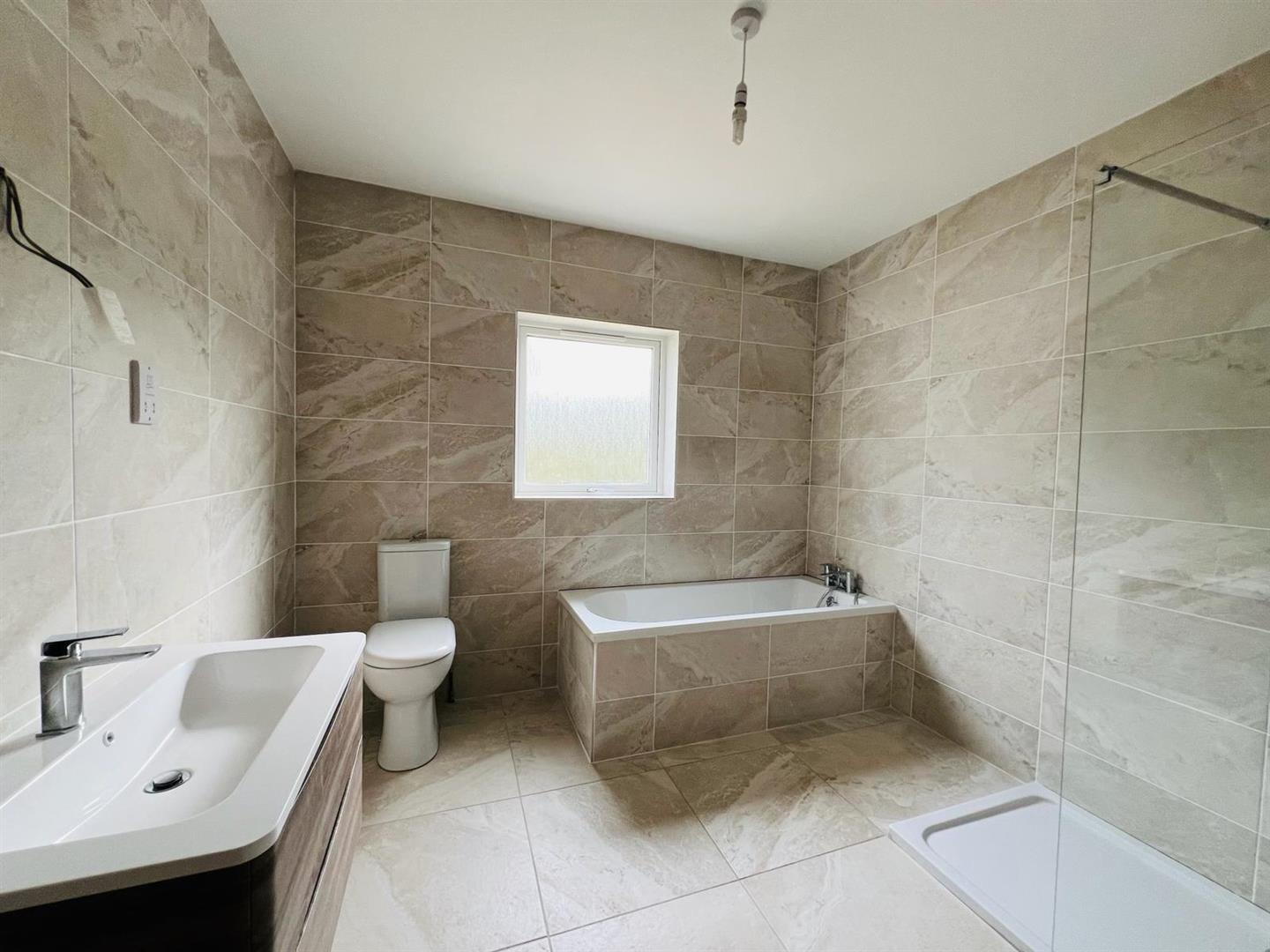 Comprising bath, walk in shower, whb set in vanity unit, wc, fully tiled walls and floor.