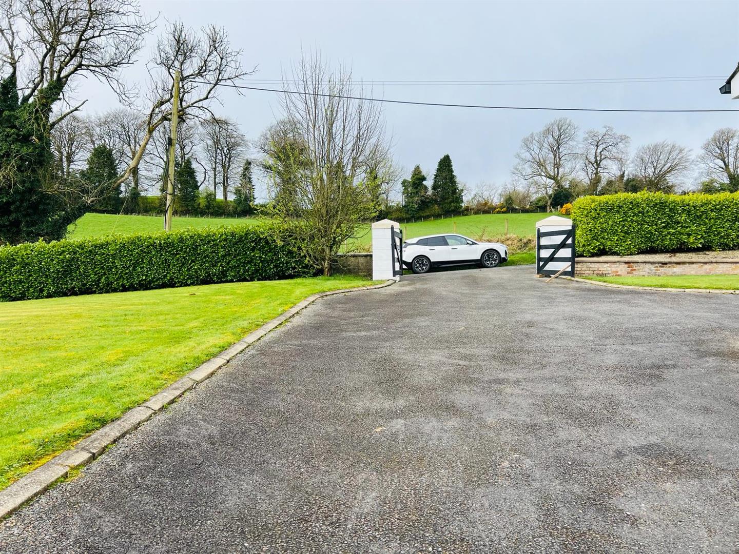 Tarmac driveway with pillars and double entrance gates.