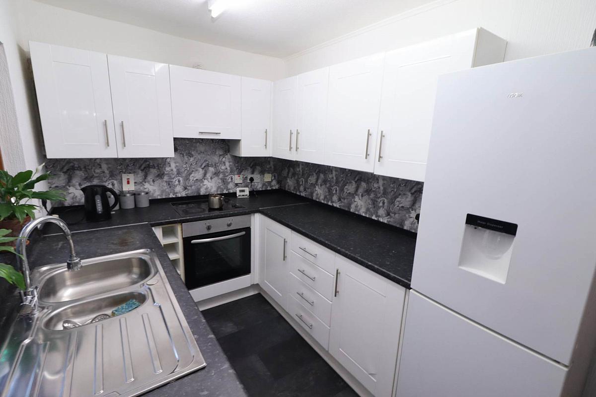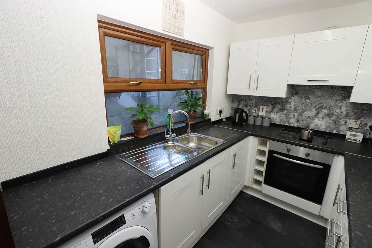 Range of high & low level units, formica work surfaces, stainless steel sink drainer, integrated hob, plumb for washing machine
