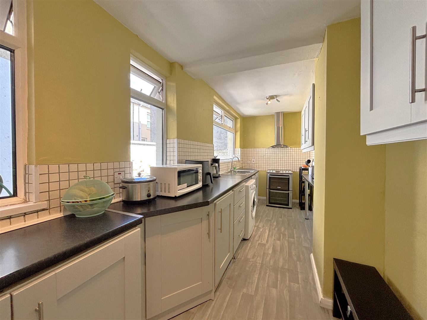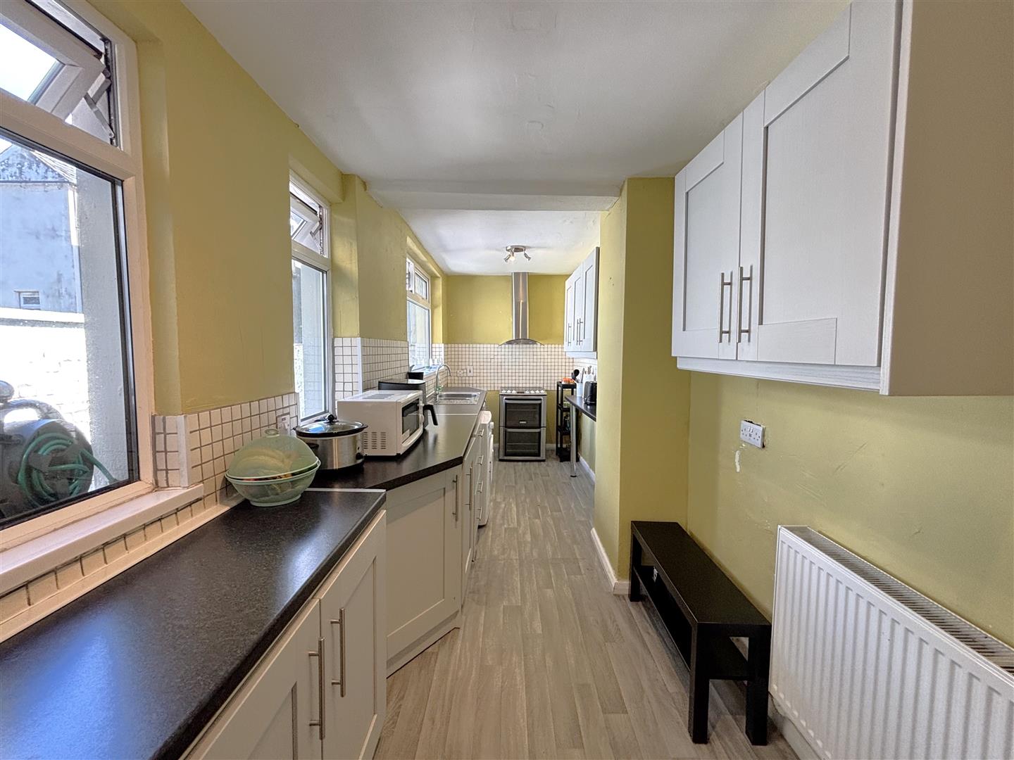 Bowl and a half stainless steel sink unit, extensive range of high and low units, formica work tops, cooker space, stainless steel extractor fan, fridge freezer space, plumbed for washing machine, breakfast bar, partly tiled walls, ceramic tiled floor, double panelled radiator, understairs storage, uPvc double glazed rear door.