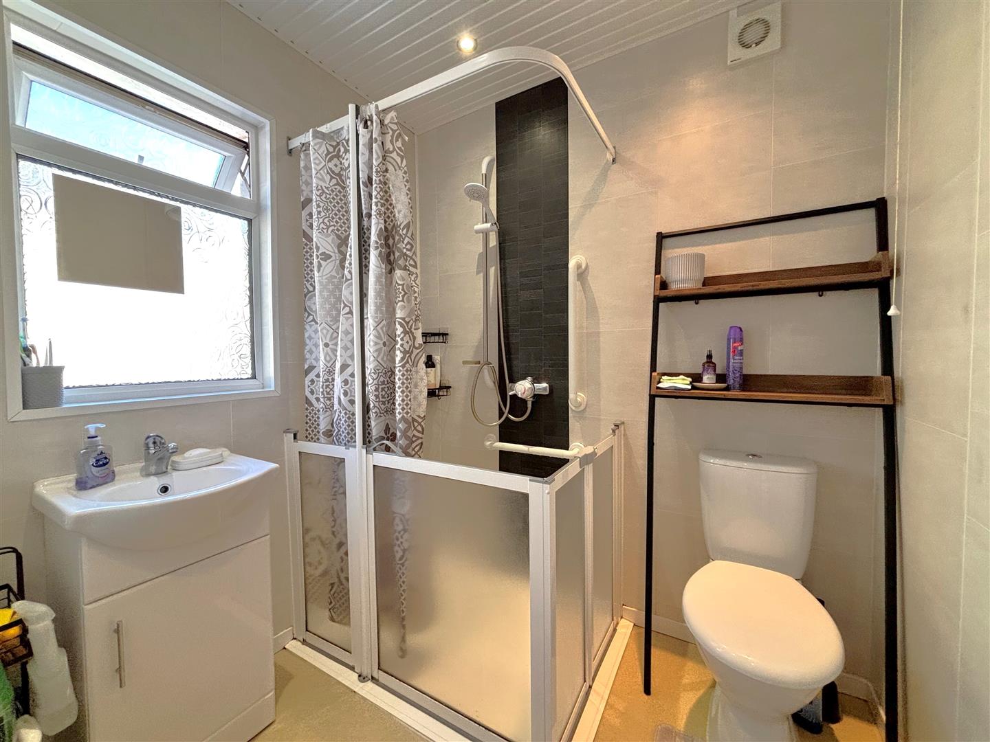 Deluxe white suite comprising disabled shower cubicle, thermostatically controlled shower unit, vanity unit, low flush wc, partly pvc panelled walls, chrome radiator, recessed lighting, extractor.