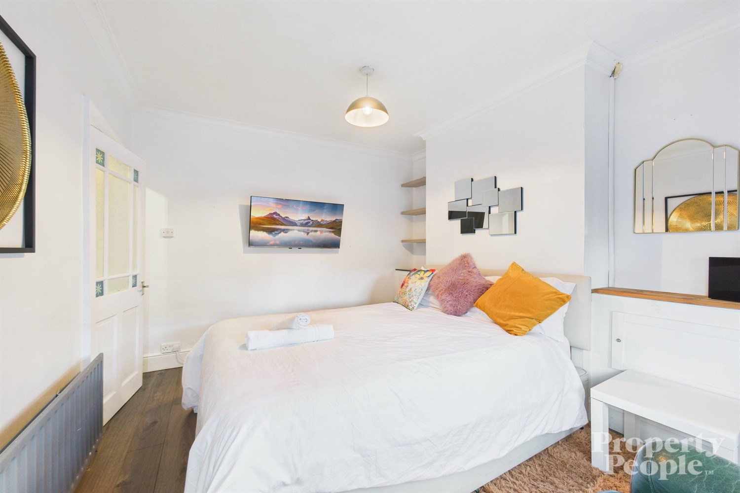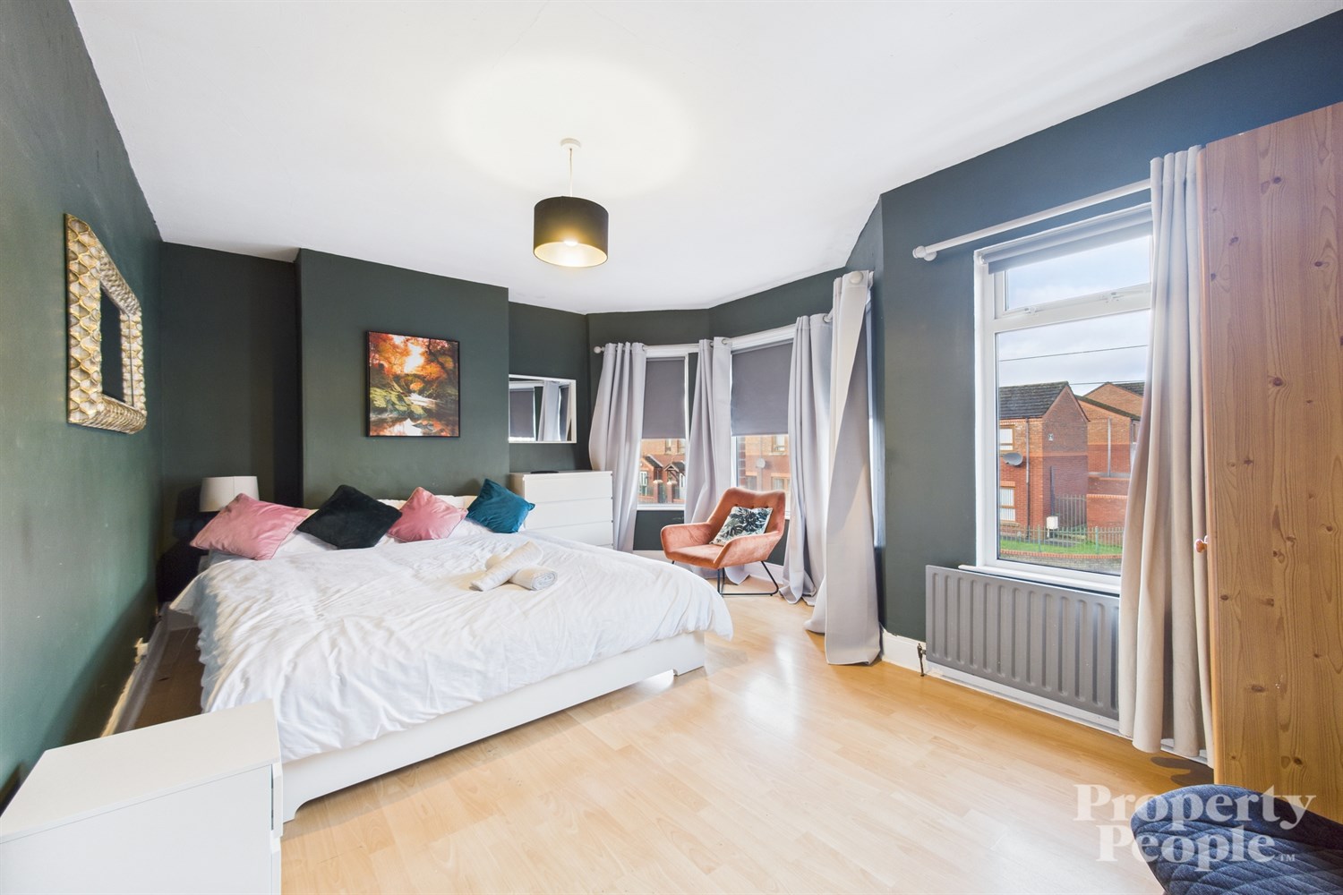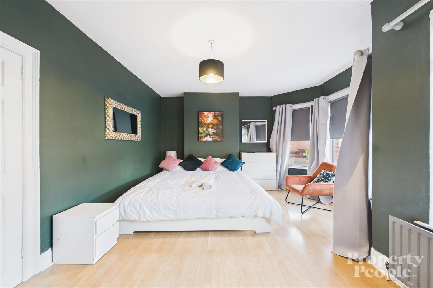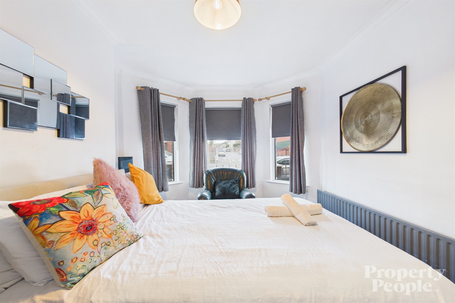 A bright and spacious master bedroom with front aspect bay window that floods the room with natural light, laminate wooden floor and single panel radiator.