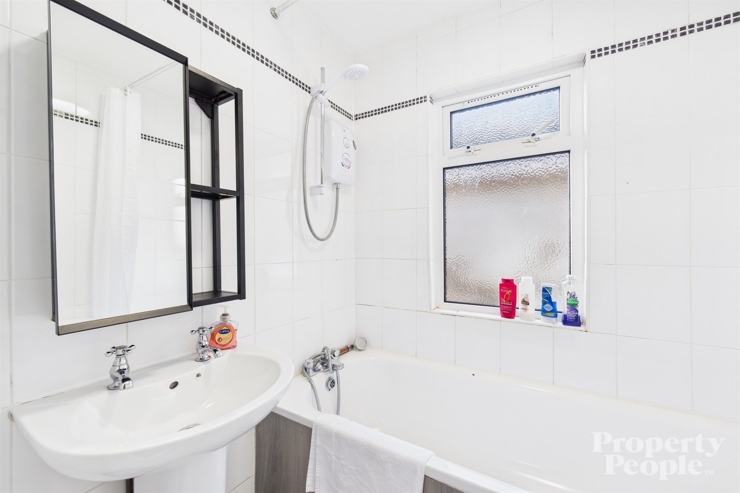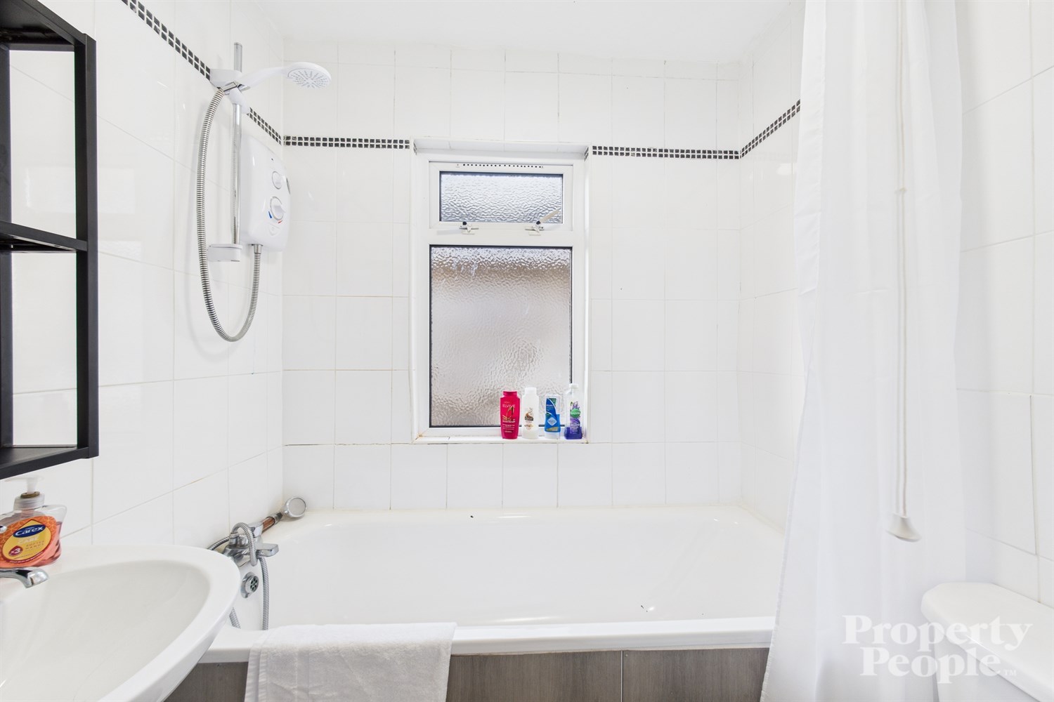 Fully tiled three piece bathroom suite, low flush WC, wash hand basin with pedestal, bath with showerhead and electric shower.