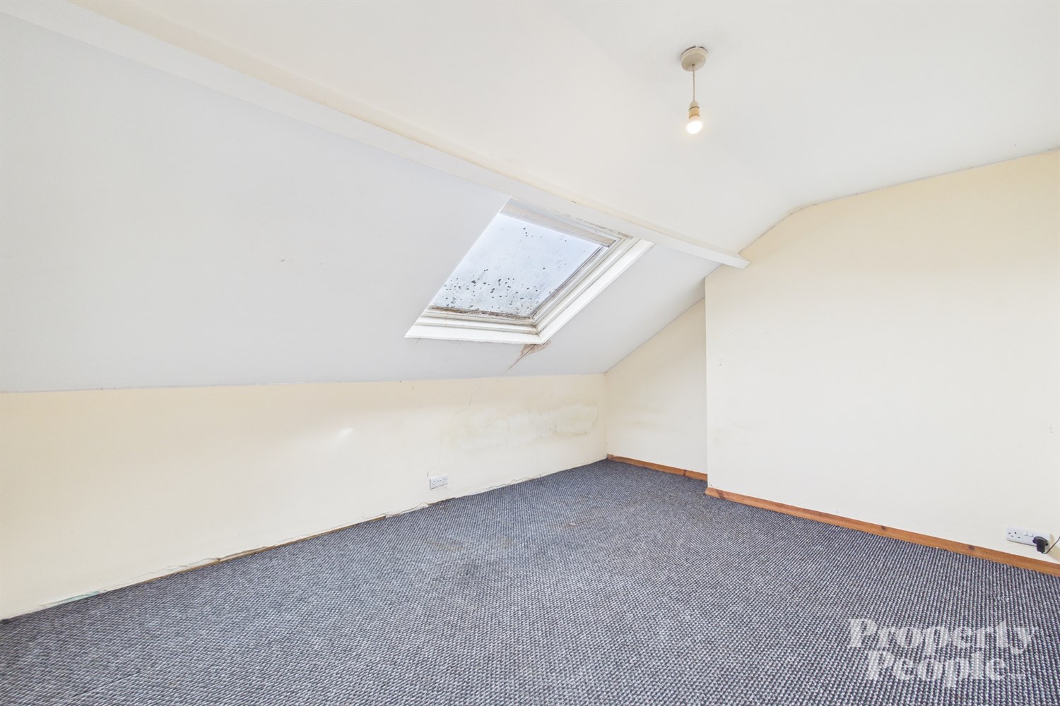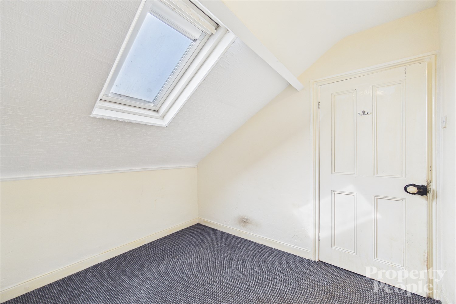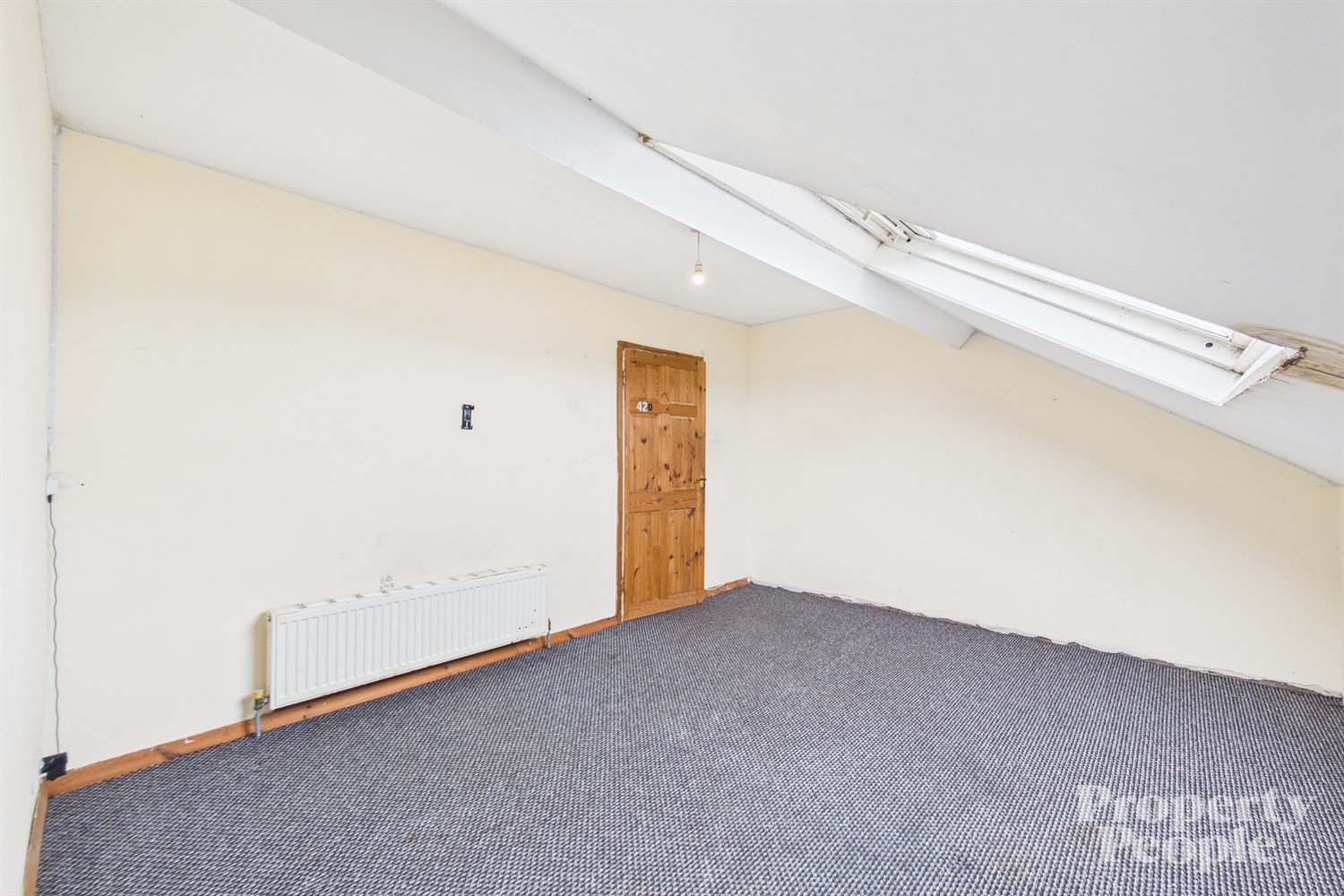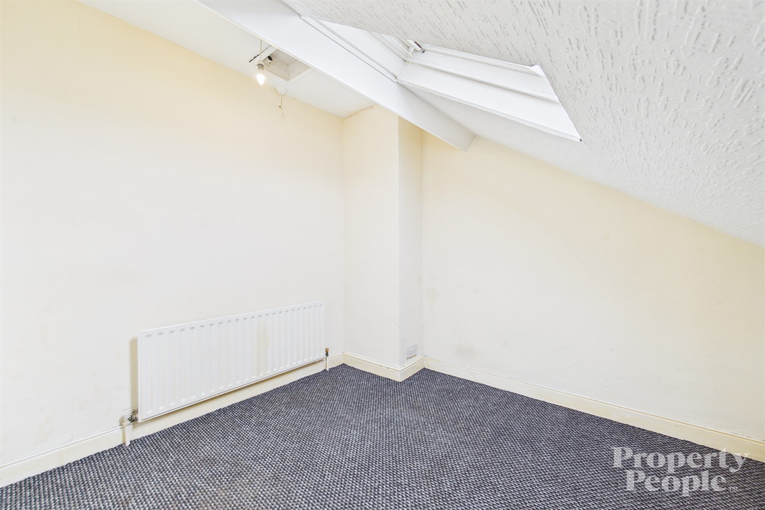 A bright and airy top-floor bedroom, featuring a Velux window that floods the room with natural light. Finished with a carpeted floor and a panelled radiator.