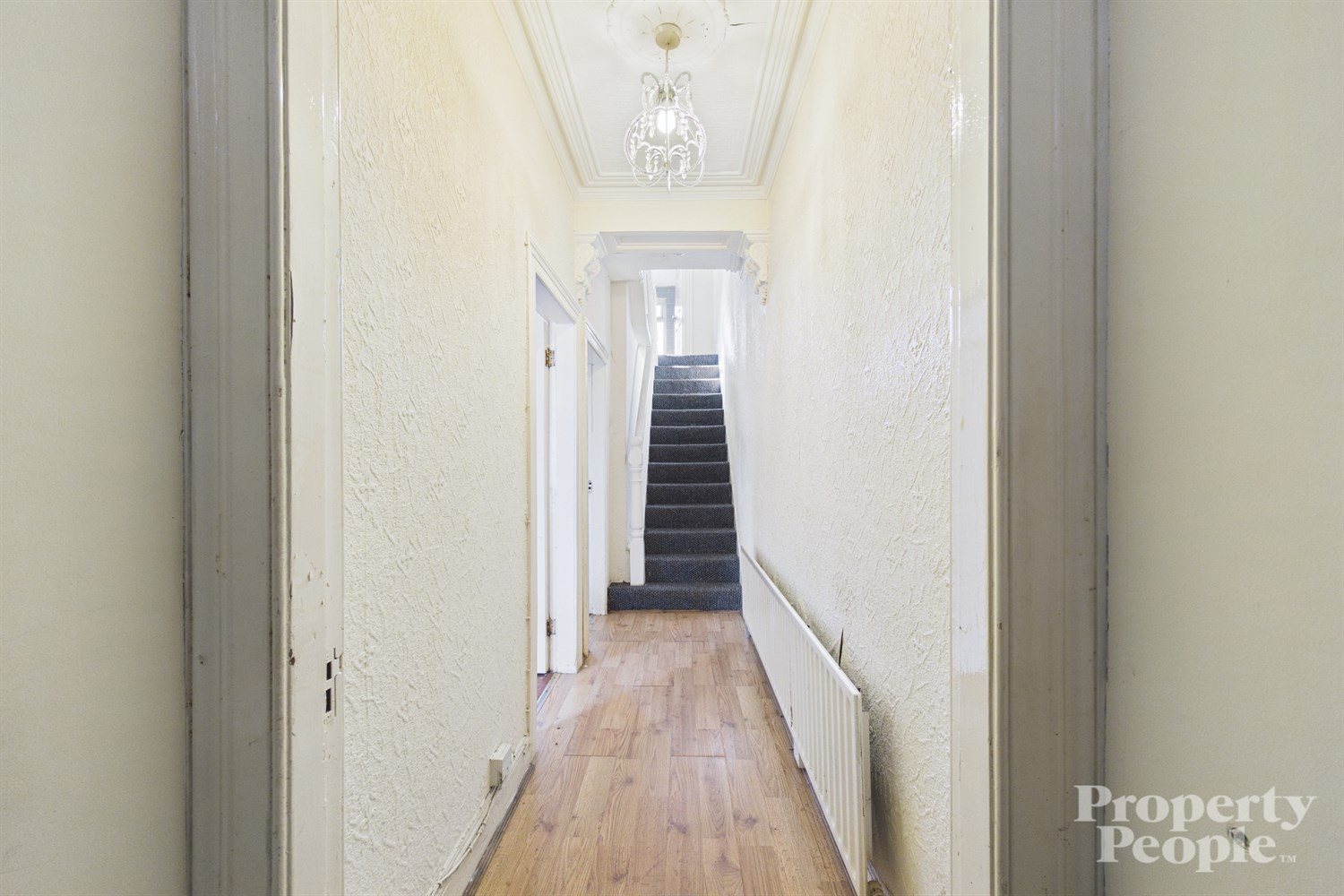 Welcoming entrance hallway with high ceiling and cornice, laminated wooden floor and single panel radiator.