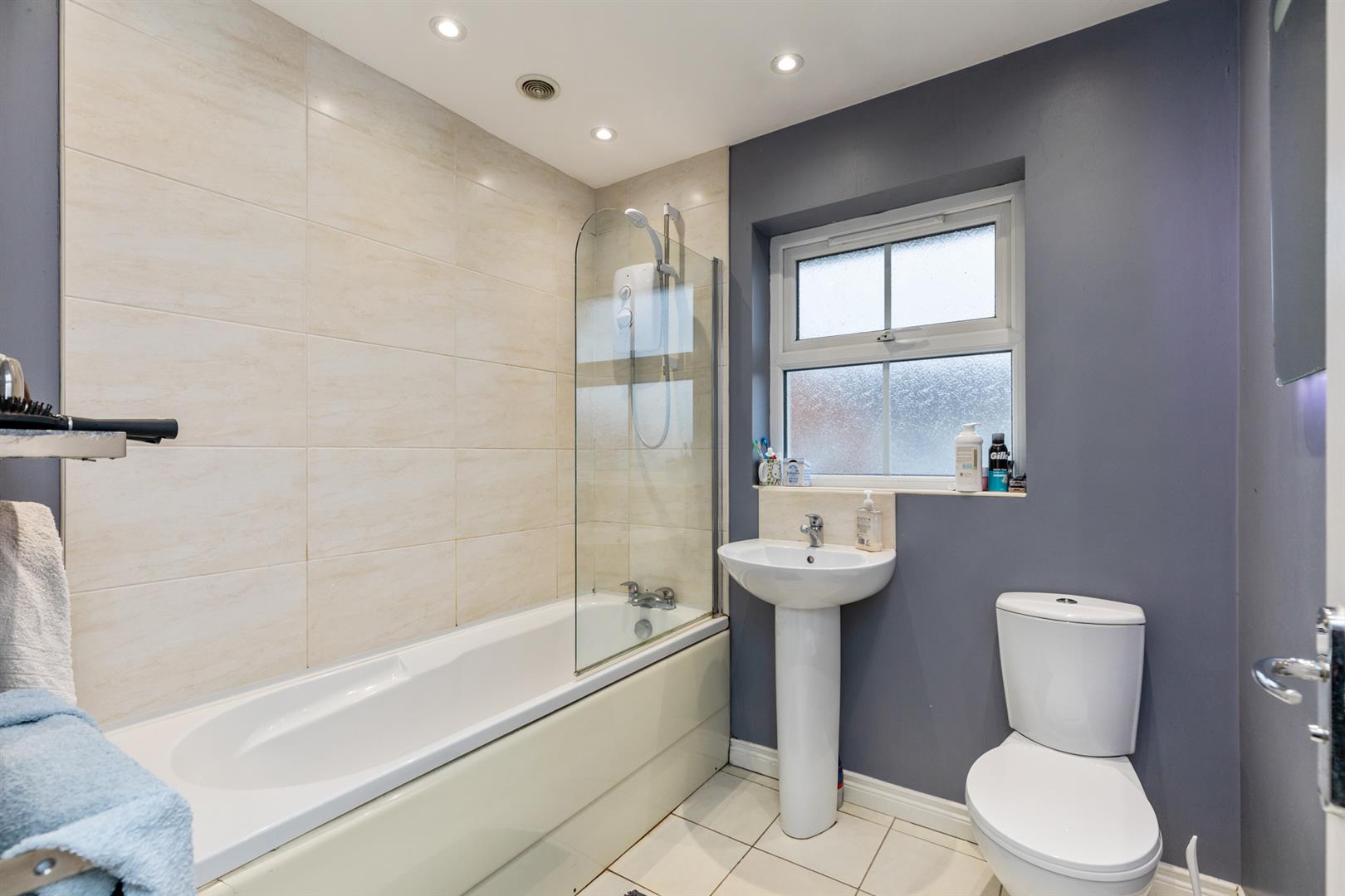 White suite comprising pedestal wash hand basin with mixer tap and tiled splashback, low flush wc, panelled bath with "Mira" Sprint overhead shower, mixer tap and glazed screen, recessed spotlighting, extractor fan, tiled flooring, part tiled walls.