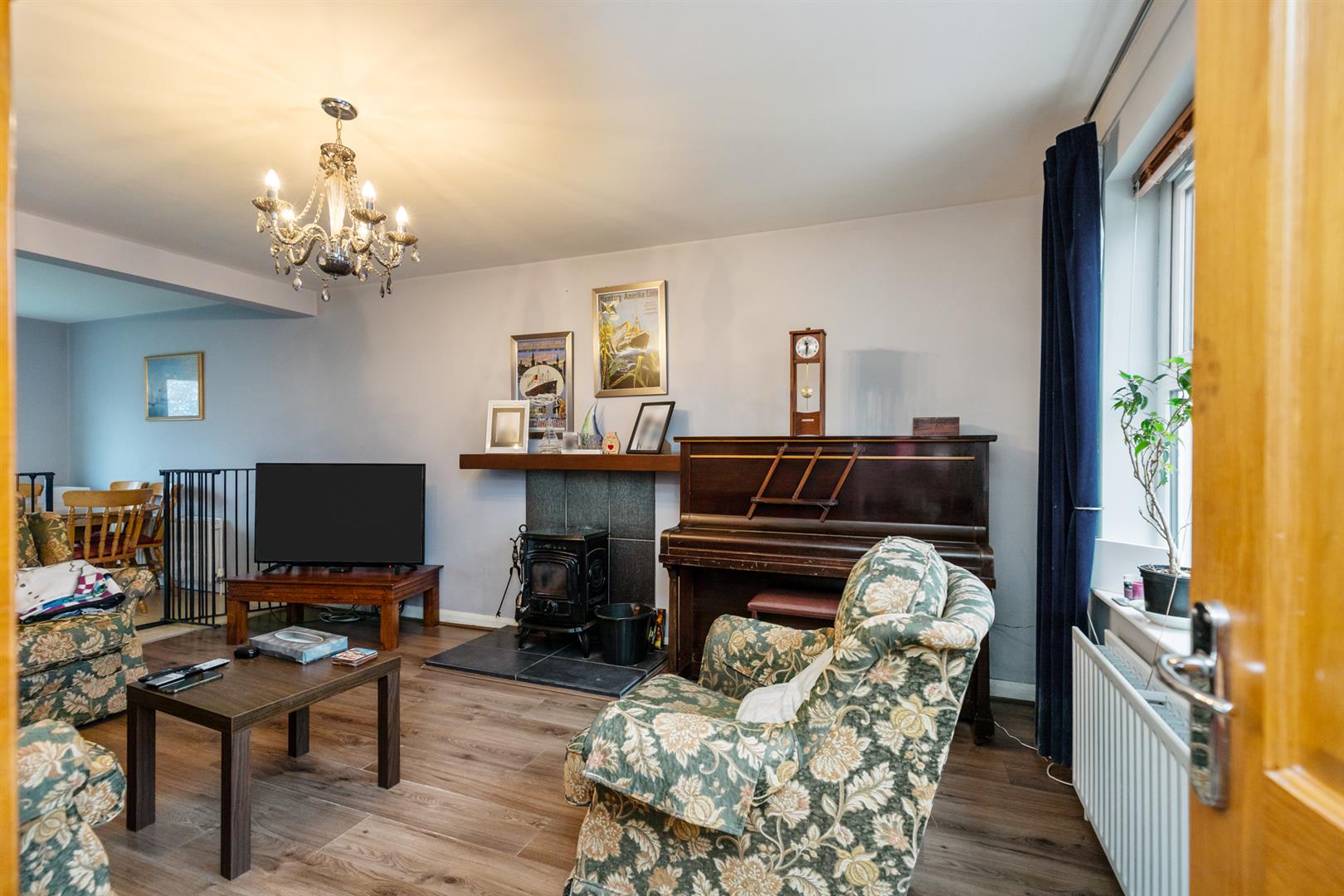 Multi fuel stove with tiled hearth and wooden mantle, wood laminate flooring, open to kitchen/dining area.