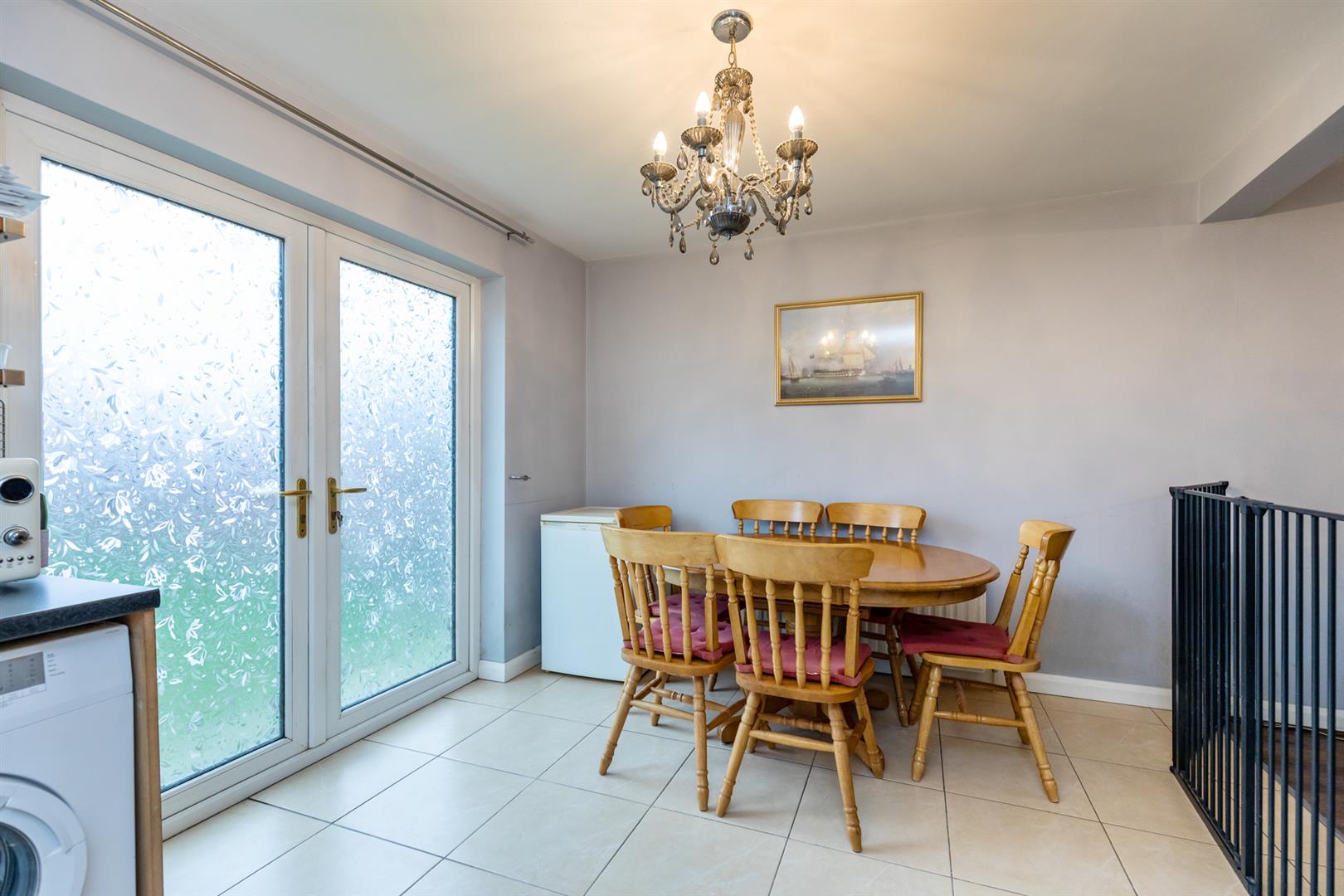 Range of high and low level units, laminate work surfaces, single stainless steel sink with built in drainer and mixer tap, space for cooker, integrated extractor fan and hood, plumbed for washing machine, tiled flooring, part tiled walls, space for dining, double doors to rear garden.