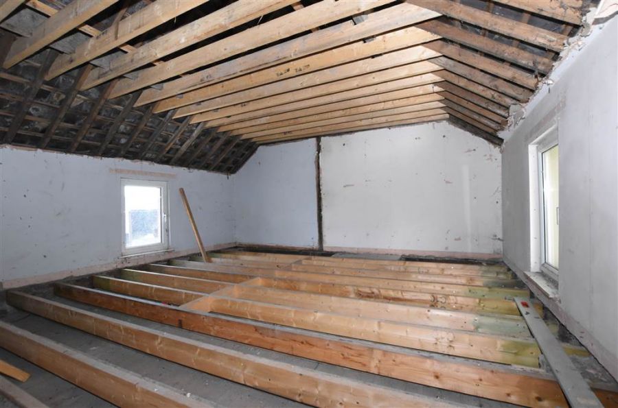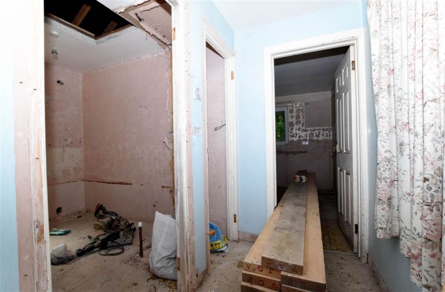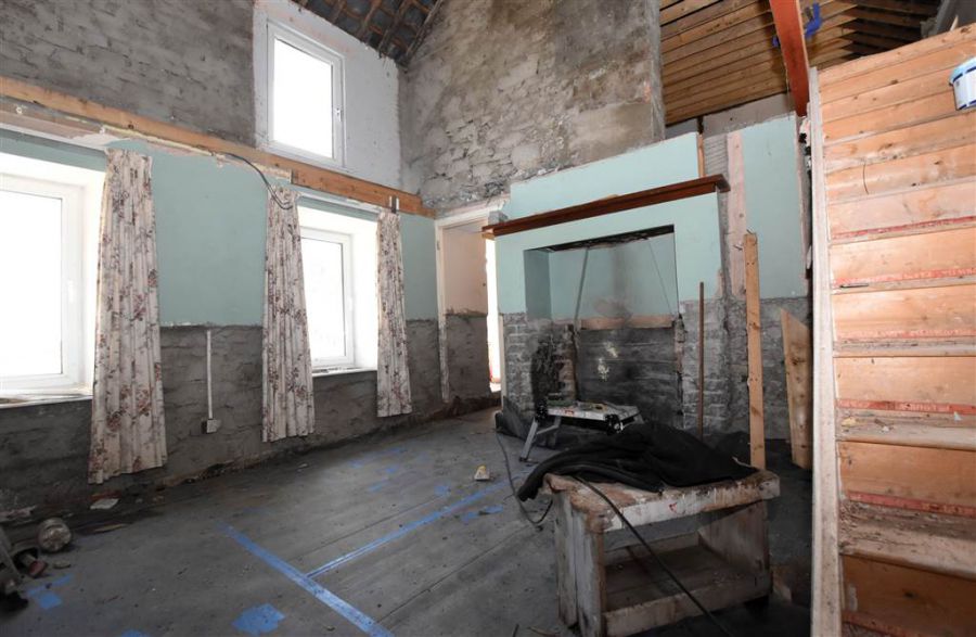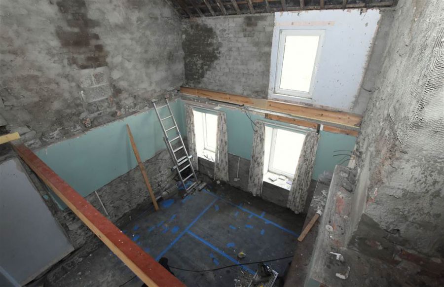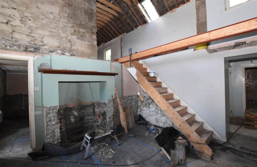Walls that have had plaster stripped have been pointed and scudded, ready for re-plastering