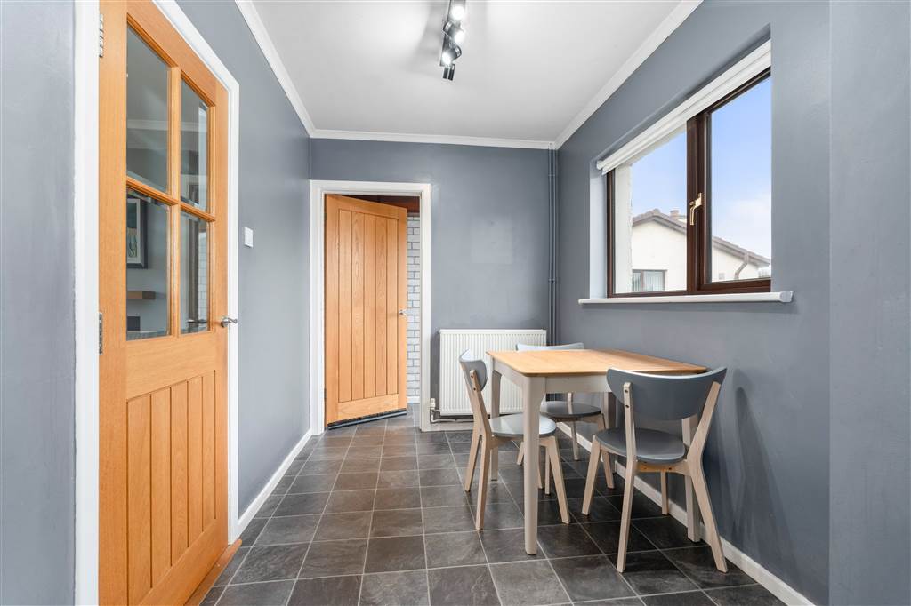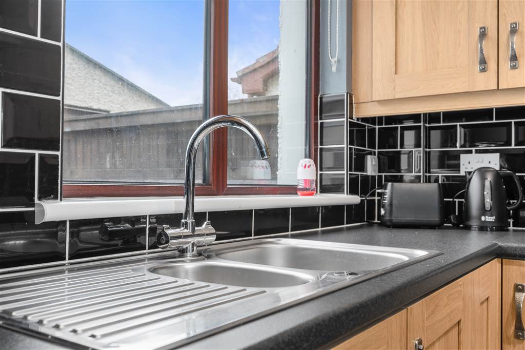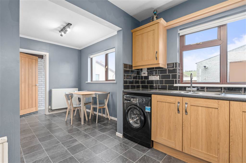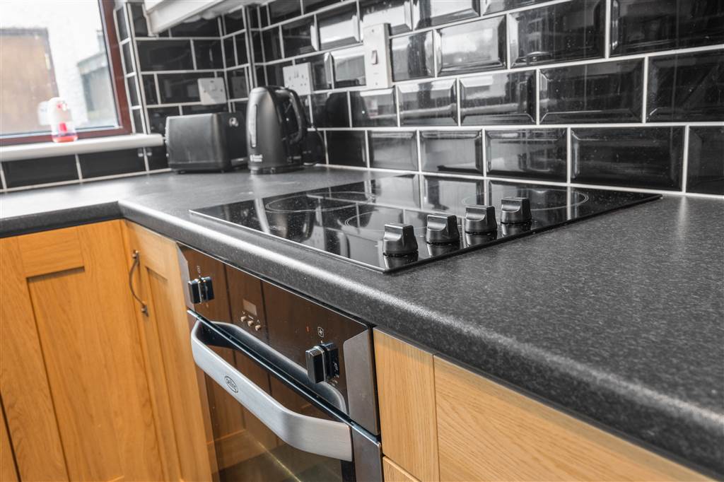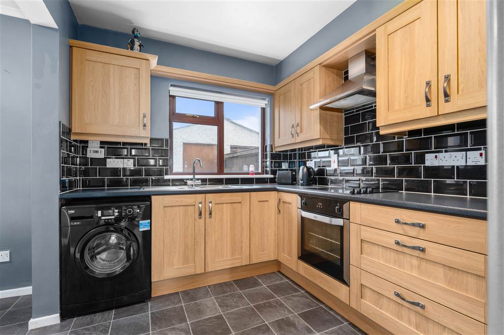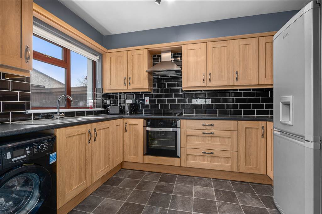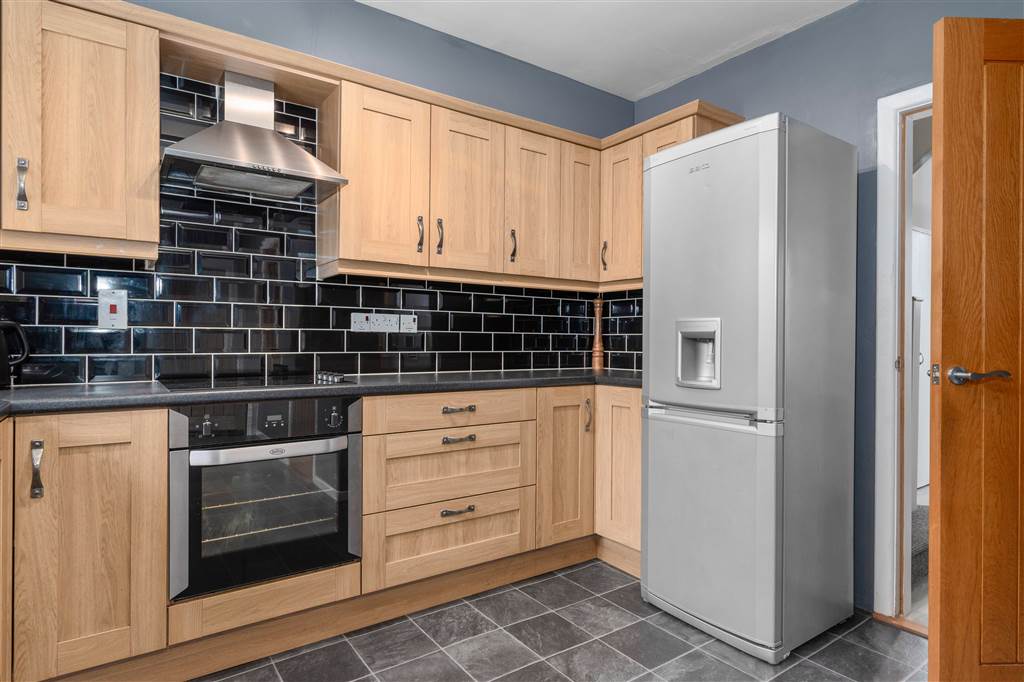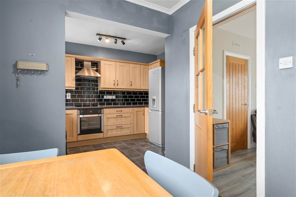 With a range of eye and low-level fitted units, 1 1/4 bowl stainless-steel sink unit and drainer with stainless-steel mixer tap. Integrated four ring electric hob and oven with stainless-steel extractor fan over. Plumbed for washing machine. Space for fridge-freezer. Cutlery drawer. Saucepan drawers. Splash back tiling. Archway through to dining room.