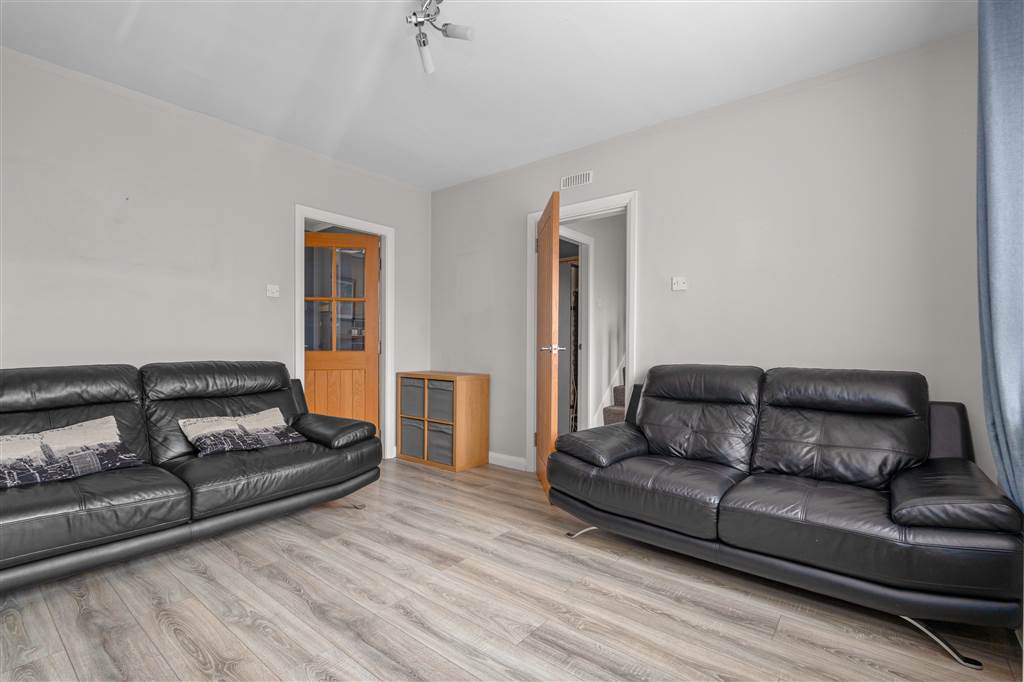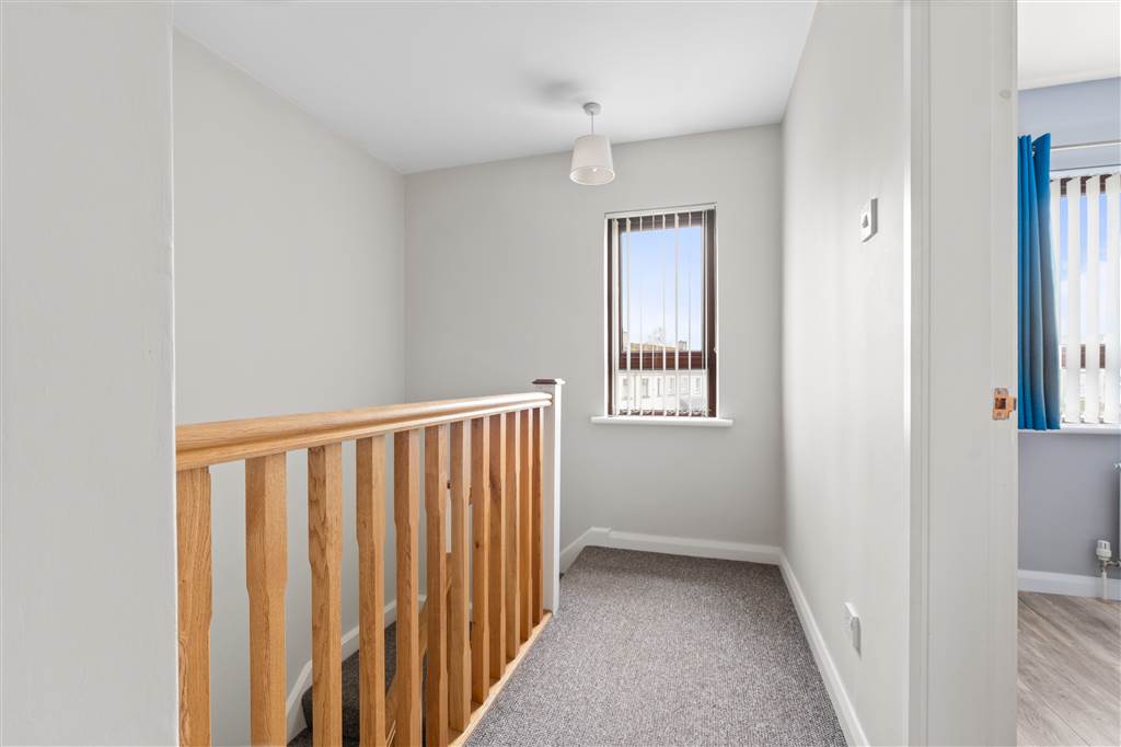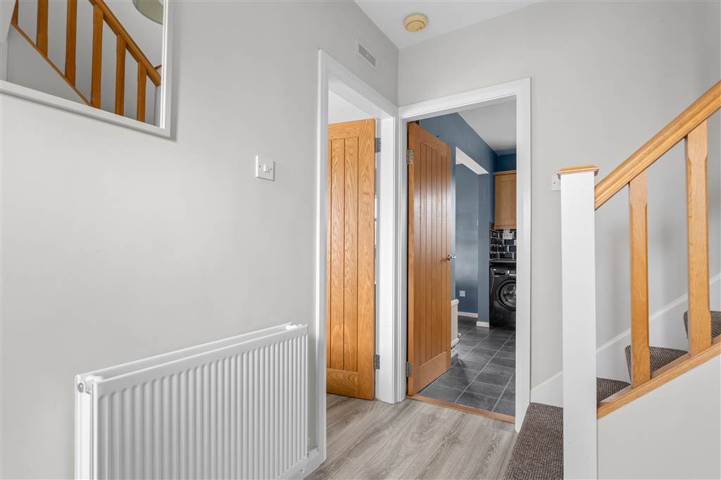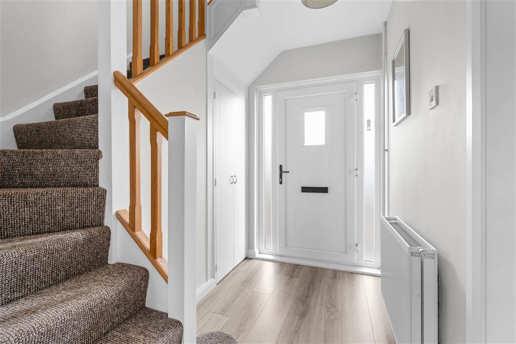 With PVC front door with glazed pane and glazed side panes. Balustrade staircase to first floor. Under stair storage cupboard. Laminated wooden flooring.