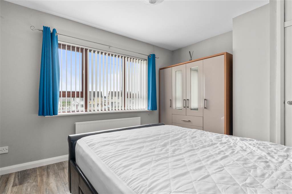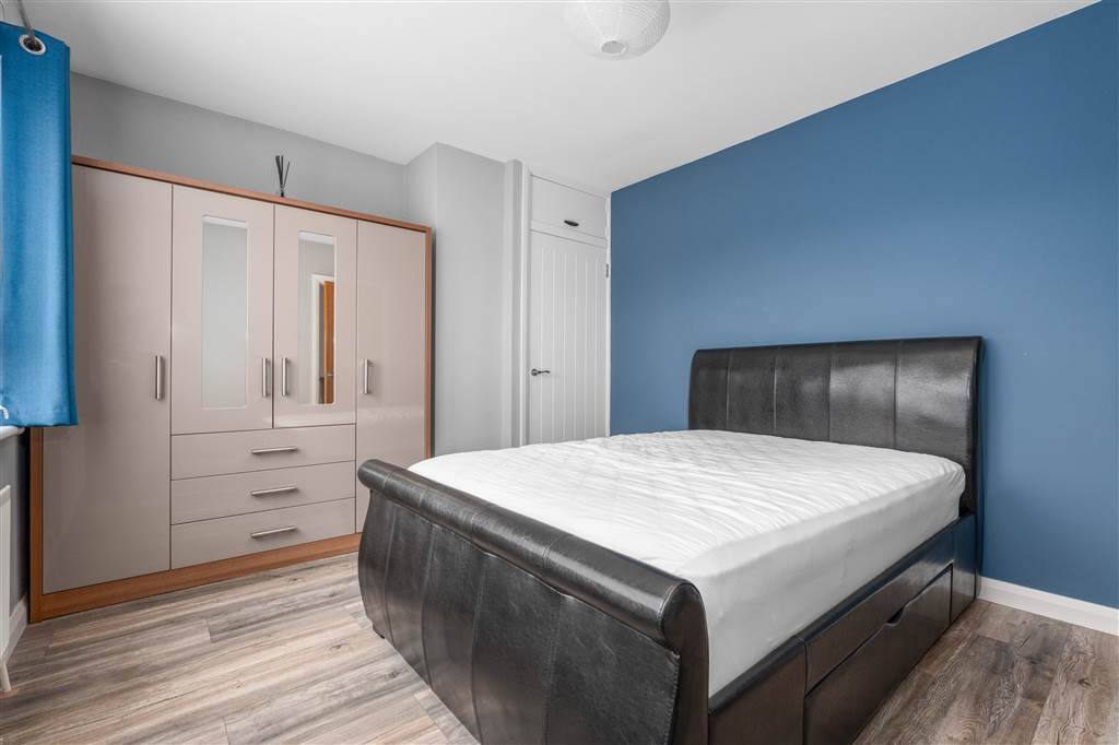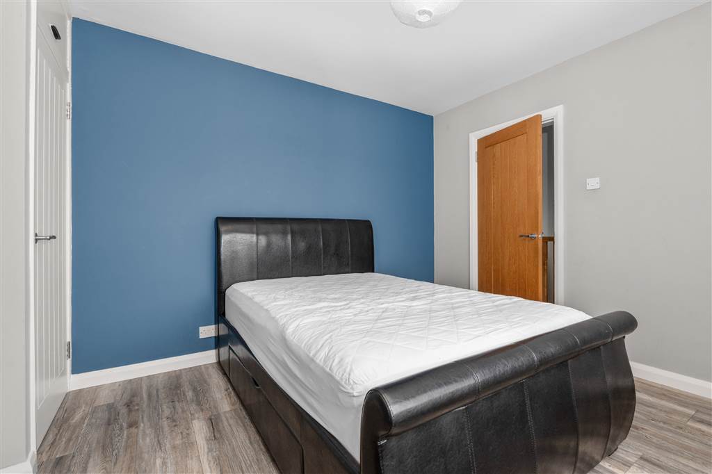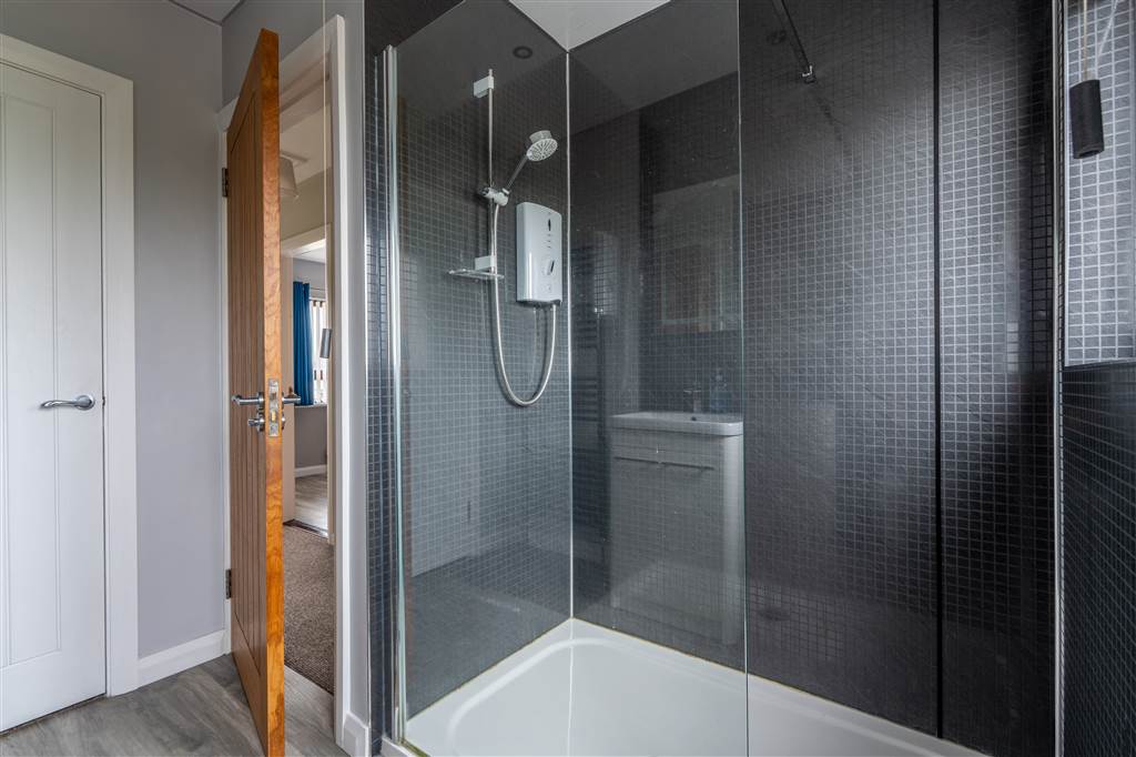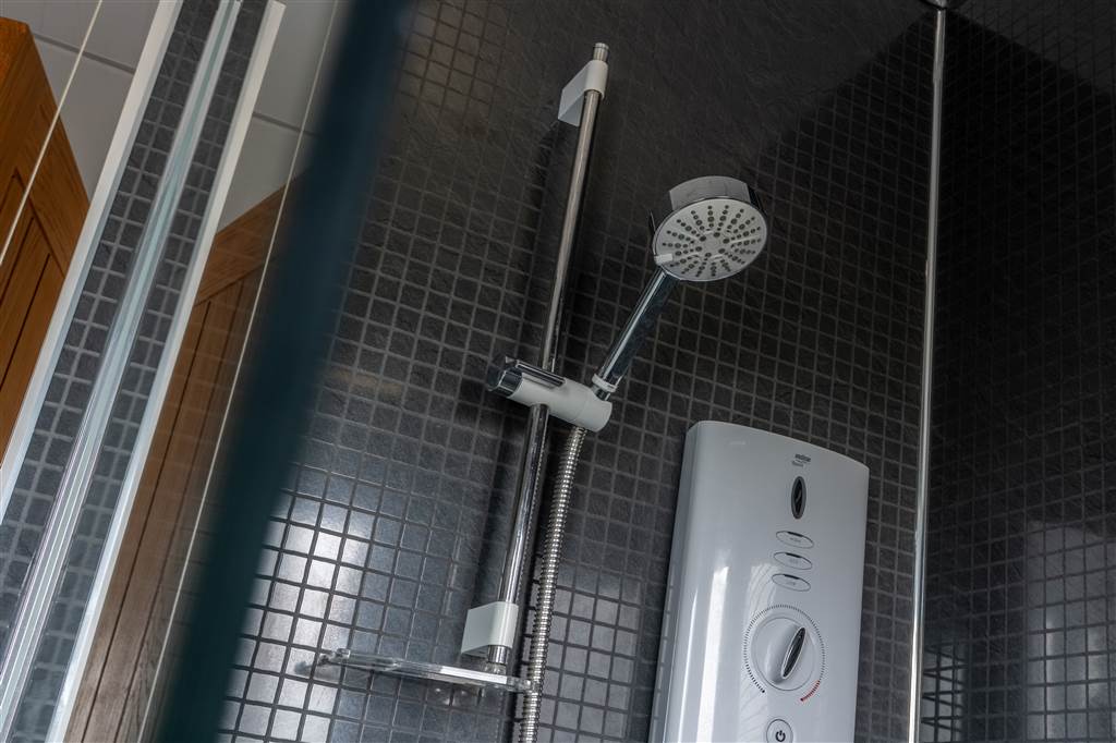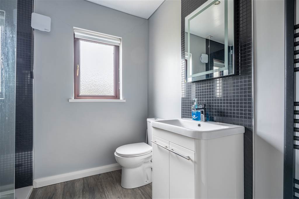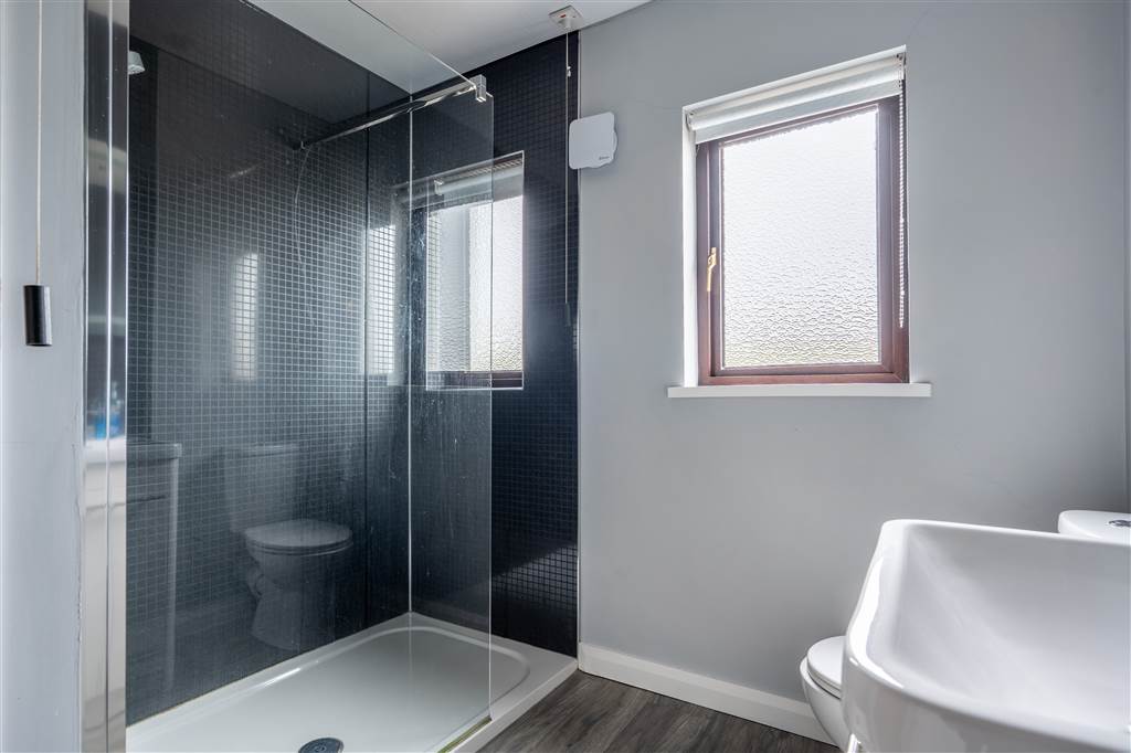 With 3-piece white suite comprising LFWC, WHB with built-in vanity unit and walk-in shower to tiled corner cubicle. Heated towel rail. Hot-press with shelved storage. High-quality waterproof laminate flooring.