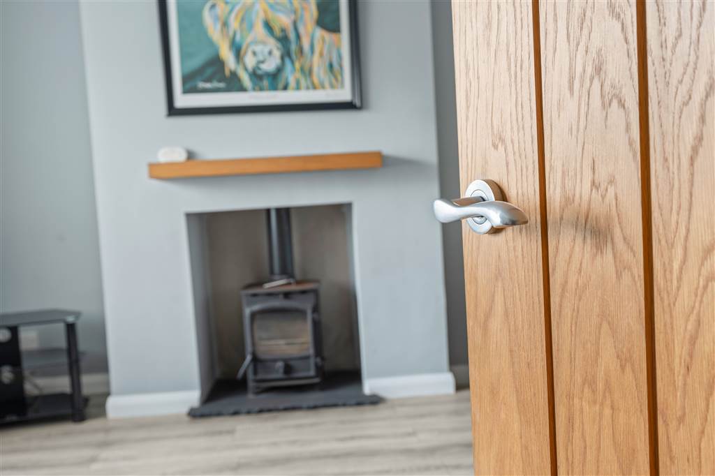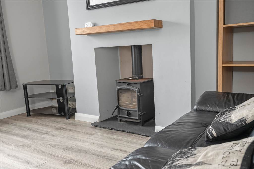With multi-fuel burning stove to slate hearth and wooden mantle. Laminated wooden flooring.