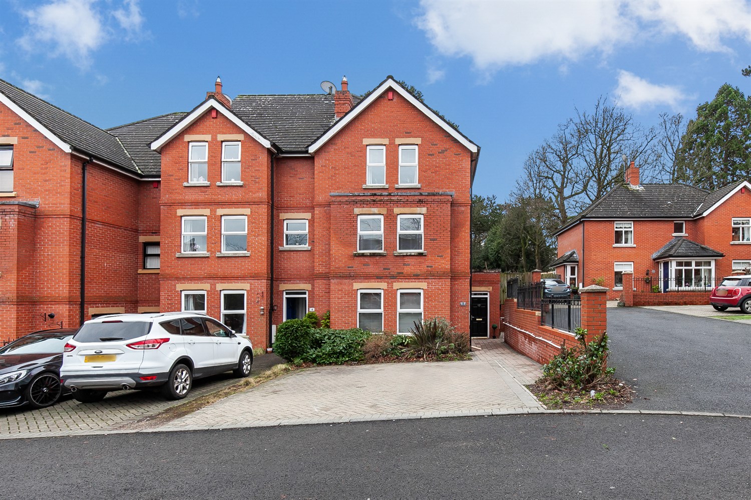 Front: Brick paviour driveway with space for two cars, mature planting.