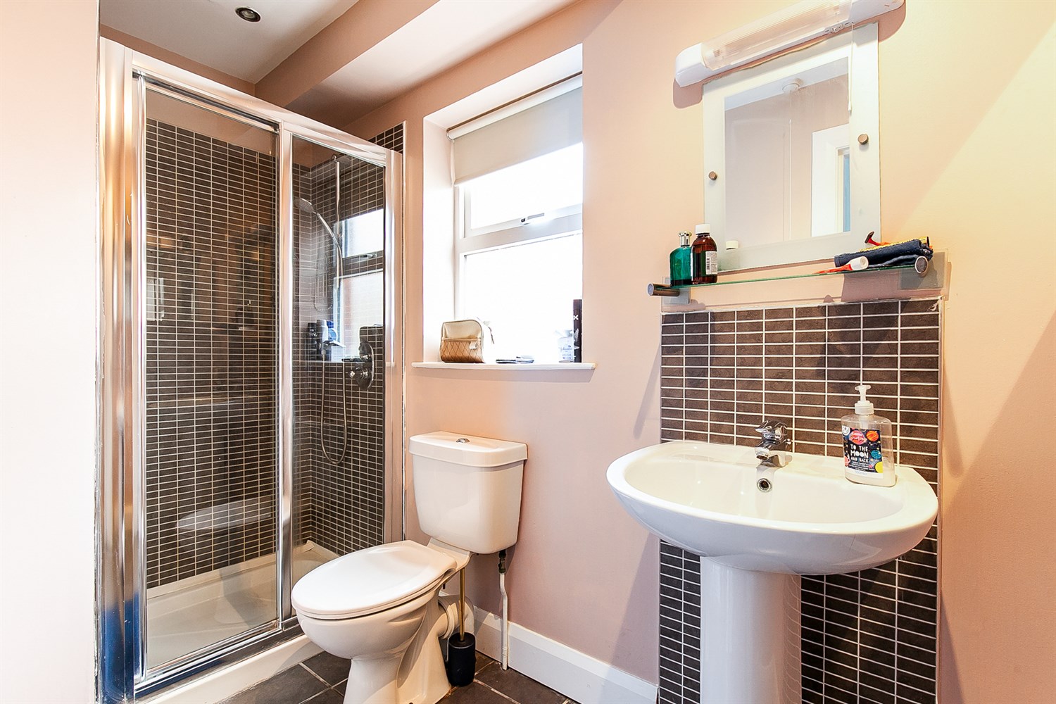 Ceramic tiled floor, wall mounted heated towel rail, white suite comprising, W.C., pedestal wash hand basin with tiled splashback, tiled shower cubicle with thermostatically controlled shower.