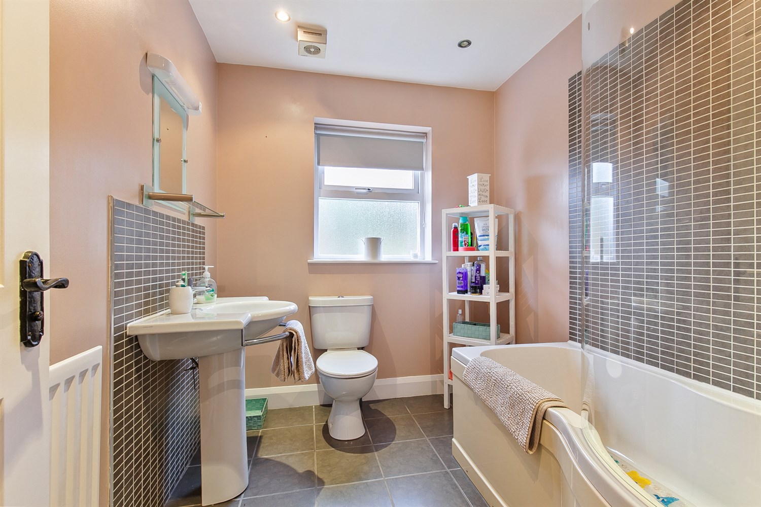 Ceramic tiled flooring, partially tiled walls, single panelled radiator, white suite comprising, pedestal wash hand basin with mixer tap, W.C., D shaped panelled bath with thermostatically controlled shower over.