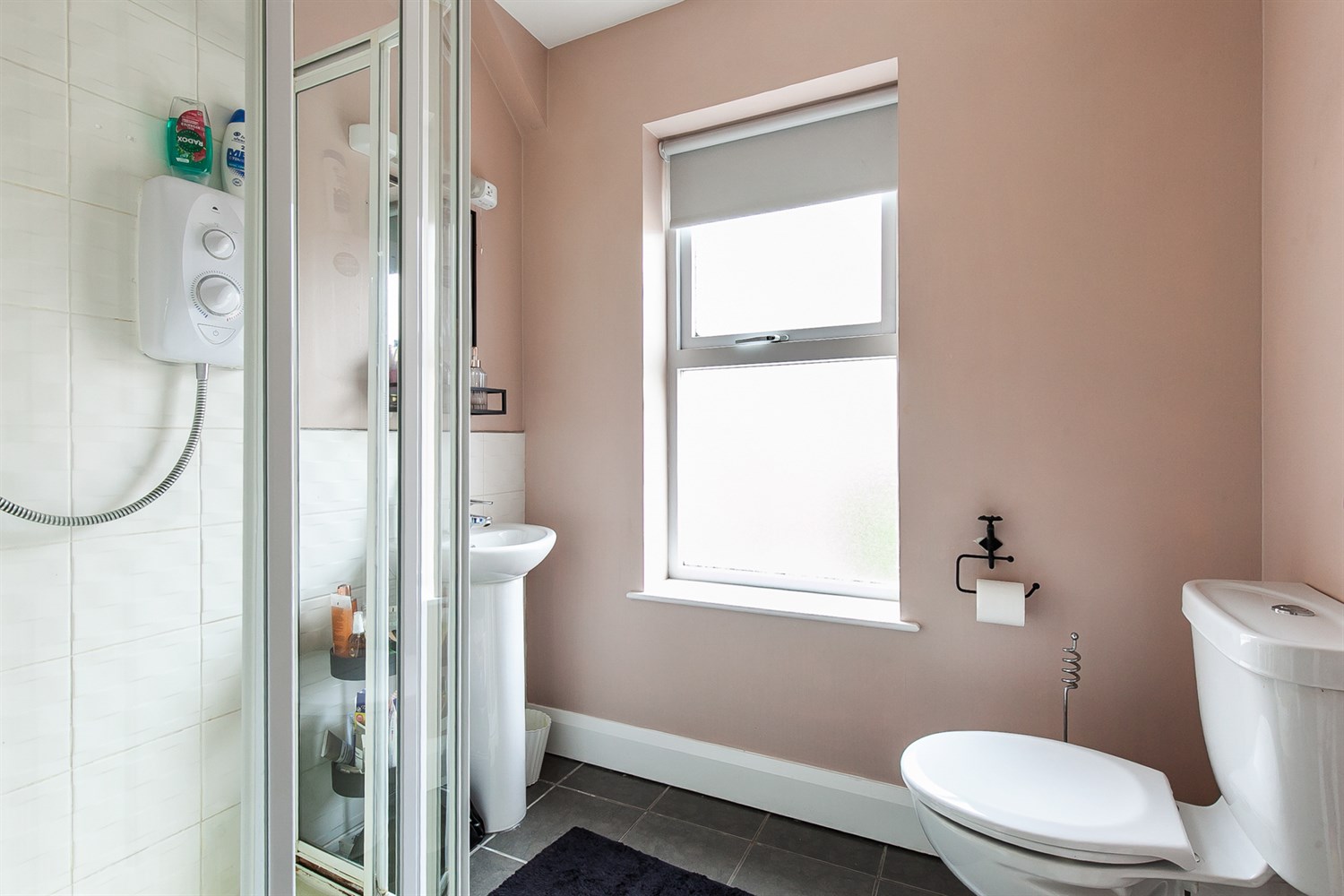 Ceramic tiled floor, white suite comprising, pedestal wash hand basin with tiled splashback, W.C., tiled shower cubicle with electric shower.