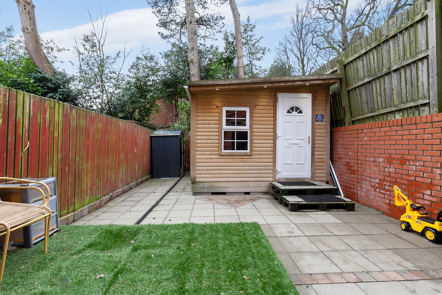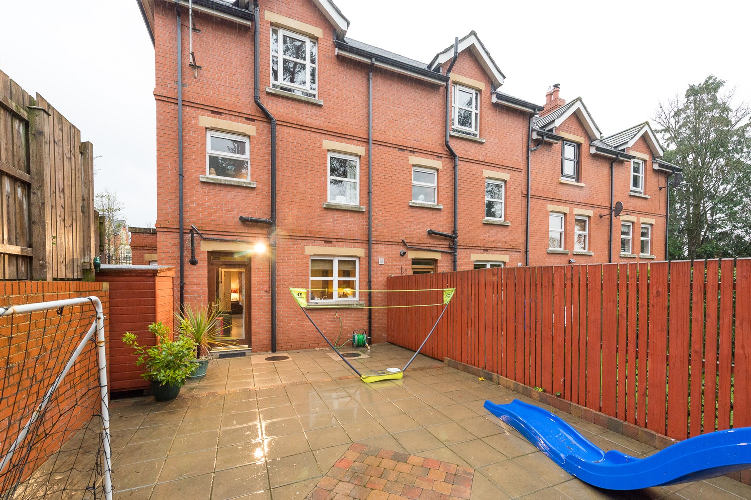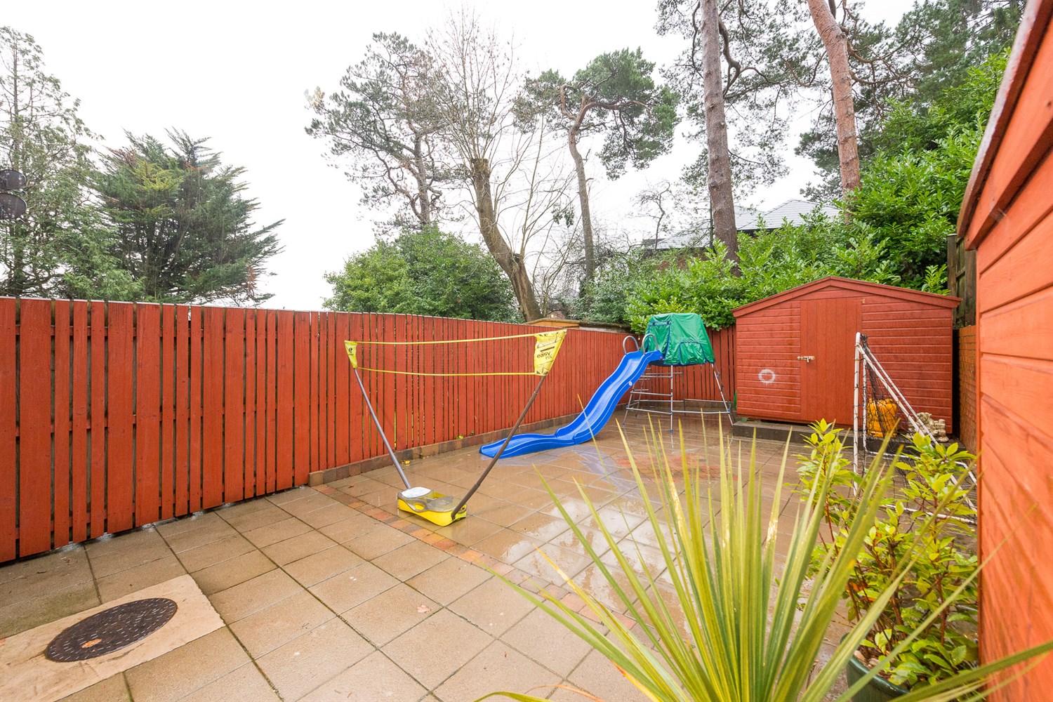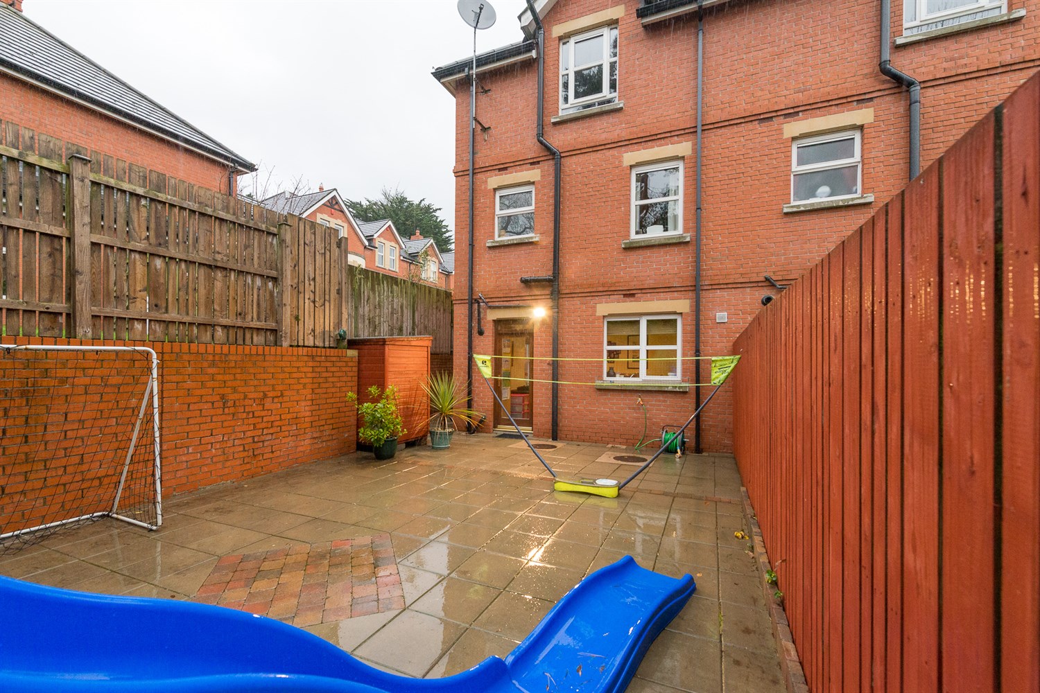 Rear: Enclosed garden in concrete paving, wood panelled fencing.