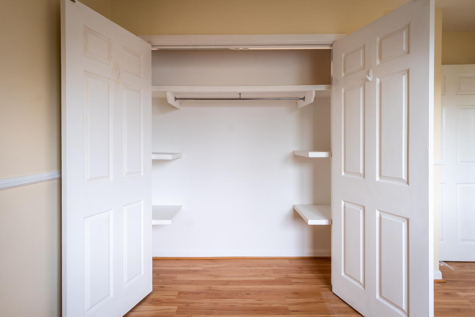 Laminate flooring, built-in wardrobe.