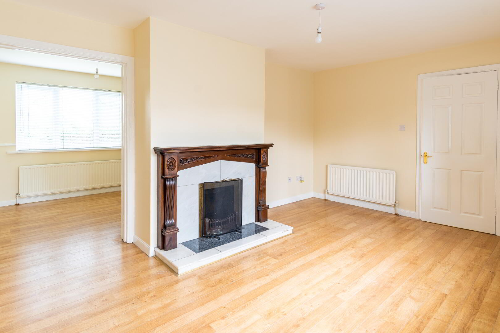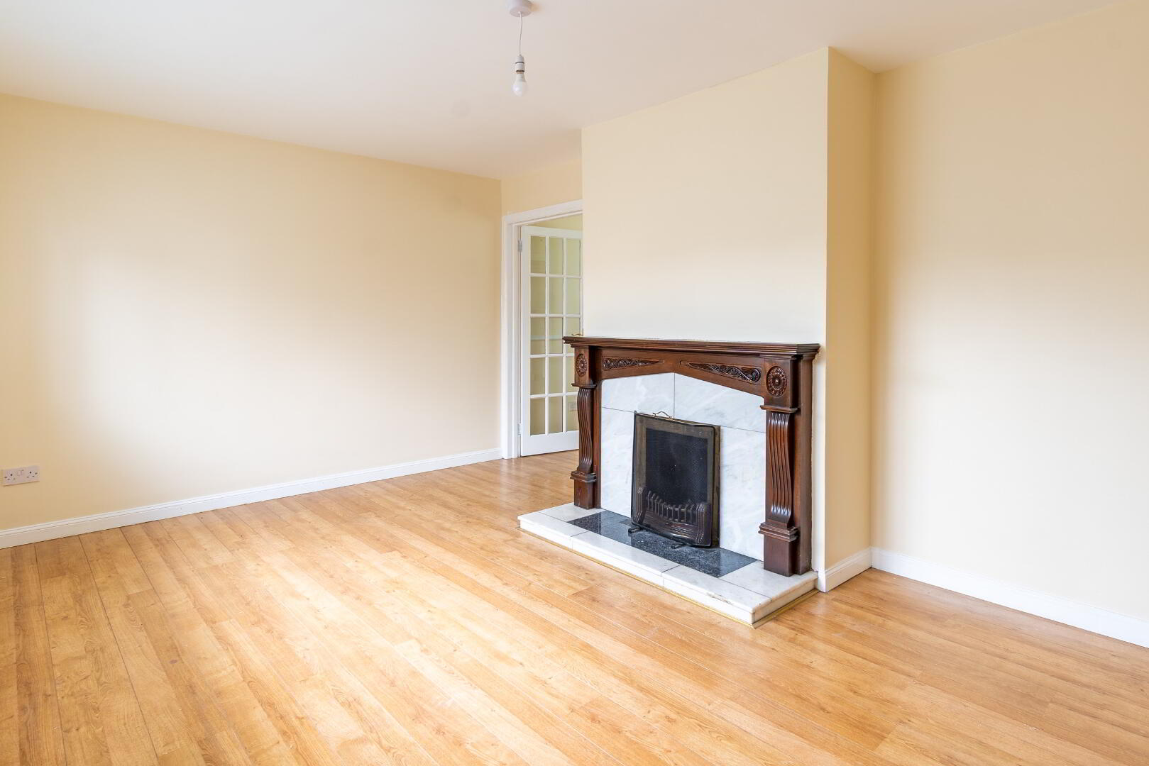 Open marble fireplace with carved mahogany surround, laminate flooring, french doors leading to Dining Room.