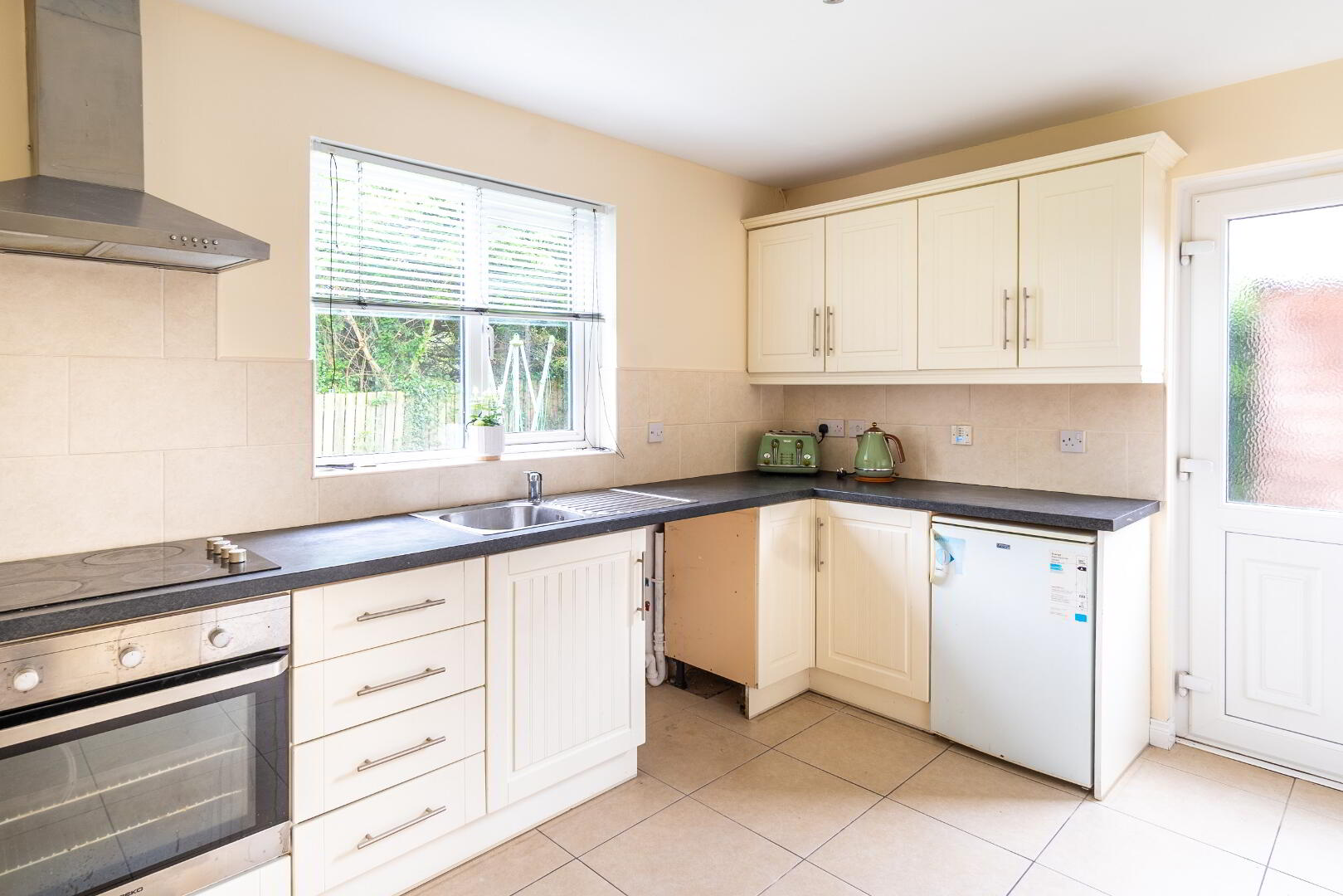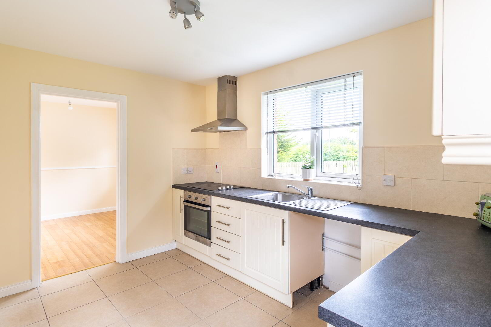 High and low laminate units, fitted oven, fitted glass hob, tiled splash back, tiled flooring, stainless steel extractor hood, plumbed for washer/dishwasher.